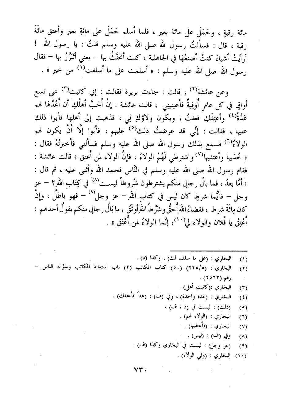 وعن عائشة (¬2)، قالت: جاءت بريرة فقالت: إني كاتبت (¬3) على تسع أواقٍ في كل عام أُوقِية فأعينينِى، قالت عائشة: إنْ أَحَبَّ أهلُكِ أن أعُدَّهَا لهم عَدَّةً (¬4) وأعتِقَكِ فعلتُ، ويكون ولاؤكِ لِي، فذهبت إلى أهلها فأبوا ذلك عليها، فقالت: إنِّي قد عرضتُ ذلك! (¬5) عليهم، فأبَوا إلَّا أَنَّ يكون لهم الولاءُ (¬6) فسمع بذلك رسول الله - صلى الله عليه وسلم - فسألني فأخبرتُهُ فقال: "خُذيها وأعتقيها (¬7) واشترطي لَهُمُ الولاءَ، فإنَ الولاء لمن أعتق" قالت عائشة: فقام رسول الله - صلى الله عليه وسلم - في النَّاس فحمد الله وأثنى عليه، ثم قال: "أمَّا بعدُ، فما بالُ رجالٍ منكم يشترطون شُروطًا ليست (¬8) في كِتَابِ اللهِ؟ -عَزَّ وَجَلَّ- فأيُّما شرطٍ كان ليس في كتاب اللهِ -عَزَّ وَجَلَّ- (¬9) - فهو باطلٌ، وإنْ كان مِائَةَ شرط، فقضاءُ الله أَحقُّ وشَرْطُ اللهَ أِوثَقُ، ما بَالُ رجالٍ منكم يقولُ أحدهم: أَعتِقْ يا فُلان والولاء لي (¬10)، إنَّما الولاءُ لمن أَعتَقَ".
