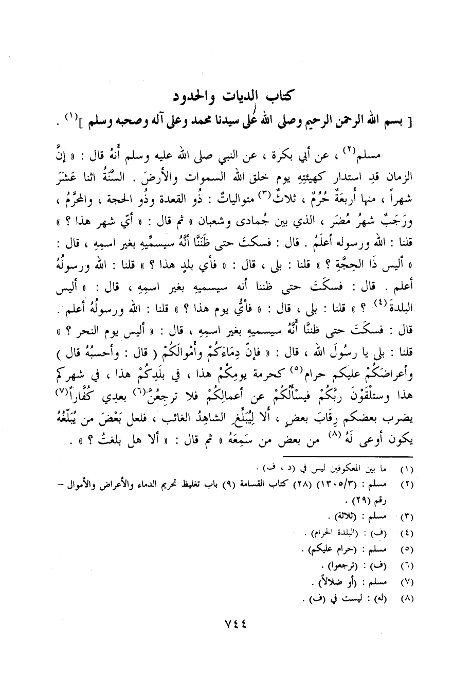 مسلم (¬2)، عن أبي بكرة، عن النبي - صلى الله عليه وسلم - أَنهُ قال: "إنَّ الزمان قدِ استدار كهيئتِهِ يوم خلق الله السموات والأرضَ. السَّنَةُ اثنا عَشَرَ شهرًا، منها أَربعَةٌ حُرُمٌ، ثلاثٌ (¬3) متوالياتٌ: ذُو القعدة وذُو الحجة، والمحرَّمُ، ورَجَبٌ شهرُ مُضَر، الذي بين جُمادى وشعبان" ثم قال: "أيّ شهر هذا؟ " قلنا: الله ورسوله أعلَمُ. قال: فسكتَ حتى ظَنَنَّا أَنَّهُ سيسمِّيهِ بغير اسمِهِ، قال: "أليس ذَا الحِجَّةِ؟ " قلنا: بلى، قال: "فأي بلدٍ هذا؟ " قلنا: الله ورسولُهُ أعلم. قال: فسكَتَ حتى ظننا أنه سيسميهِ بغير اسمِهِ، قال: "أليس البلدةَ (¬4)؟ " قلنا: بلى، قال: "فأيُّ يوم هذا؟ " قلنا: الله ورسولُهُ أعلم. قال: فسكَتَ حتى ظننَّا أَنَّهُ سيسميهِ بغير اسمِهِ، قال: "أليس يوم النحر؟ " قلنا: بلى يا رسُولَ الله، قال: "فإنّ دِمَاءَكُمْ وأَموالَكُمْ (قال: وأحسبُهُ قال) وأعراضَكُمْ عليكم حرام (¬5) كحرمة يومِكُمْ هذا، في بلَدِكُمْ هذا، في شهركم هذا وستلْقَوْنَ ربَّكُمْ فيسْأَلُكُمْ عن أعمالِكُمْ فلا ترجِعُنَّ (¬6) بعدِي كُفَّارًا (¬7) يضرب بعضكم رِقَابَ بعضٍ، ألا لِيُبَلِّغِ الشاهِدُ الغائب، فلعل بَعْضَ من يُبَلّغُهُ يكون أوعى لَه (¬8) من بعض من سَمِعَهُ" ثم قال: "ألا هل بلغتُ؟ ".