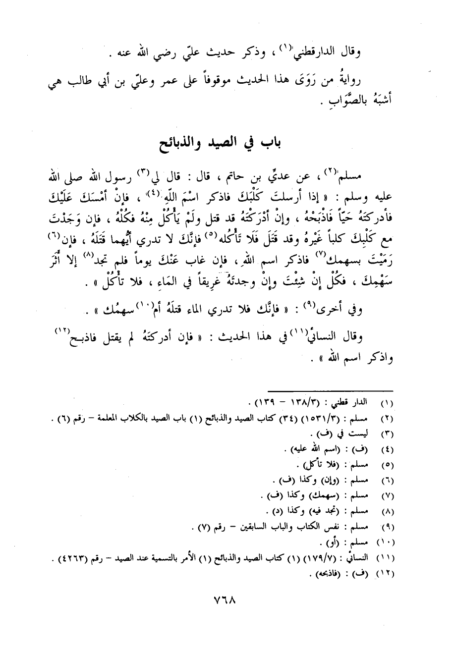 مسلم (¬2)، عن عديِّ بن حاتم، قال: قال لي (¬3) رسول الله - صلى الله عليه وسلم -: "إذا أرسلتَ كَلْبَكَ فاذكر اسْمَ اللهِ (¬4)، فإنْ أمْسَكَ عَلَيْكَ فأدركتَهُ حَياً فَاذْبَحْهُ، وإنْ أدْرَكْتَهُ قد قتل ولَمْ يَأكُلْ مِنْهُ فكُلْهُ، فإن وَجَدْتَ مع كَلْبِكَ كلباً غَيْرهُ وقد قَتَلَ فَلَا تَأكُله (¬5) فإنَّكَ لا تدري ايهما قَتَلَهُ، فإن (¬6) رَمَيْتَ بسهمك (¬7) فاذكر اسم اللهِ، فإن غاب عَنْكَ يوماً فلم تجد (¬8) إلا أثَرَ سَهْمِكَ، فكُلْ إنْ شِئْتَ وإنْ وجدتَهُ غرِيقاً في المَاءِ، فلا تأكل (6).