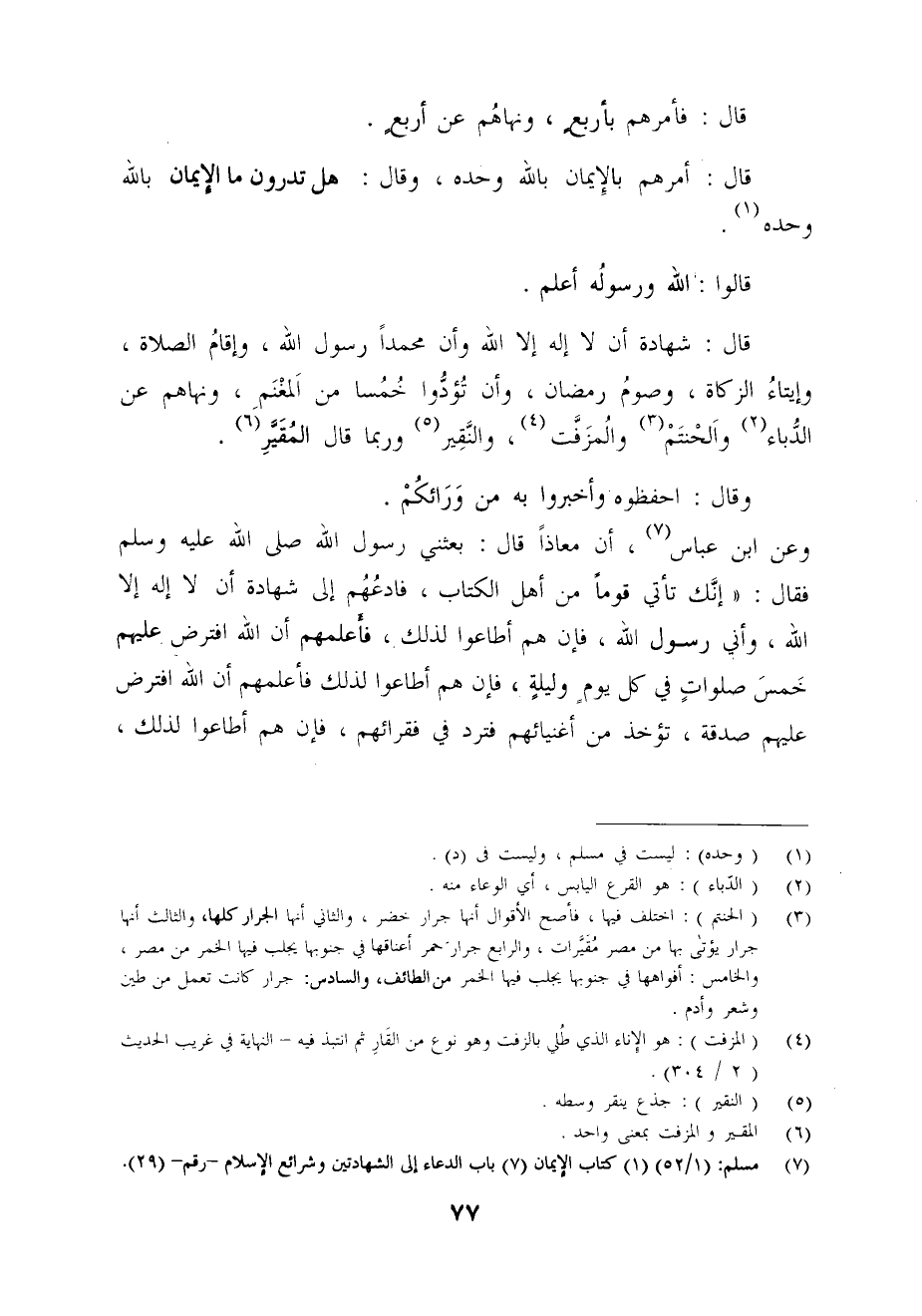 قال: شهادة أن لا إله إلا الله وأن محمداً رسول الله، وإقامُ الصلاة، وإيتاءُ الزكاة، وصومُ رمضان، وأن تُؤدُّوا خُمُسا من المَغْنَمِ، ونهاهم عن الدُّباء (¬2) والْحَنتَمْ (¬3) والُمزَفَّت (¬4)، والنَّقِير (¬5) وربما قال المُقَيَّرِ (¬6).
