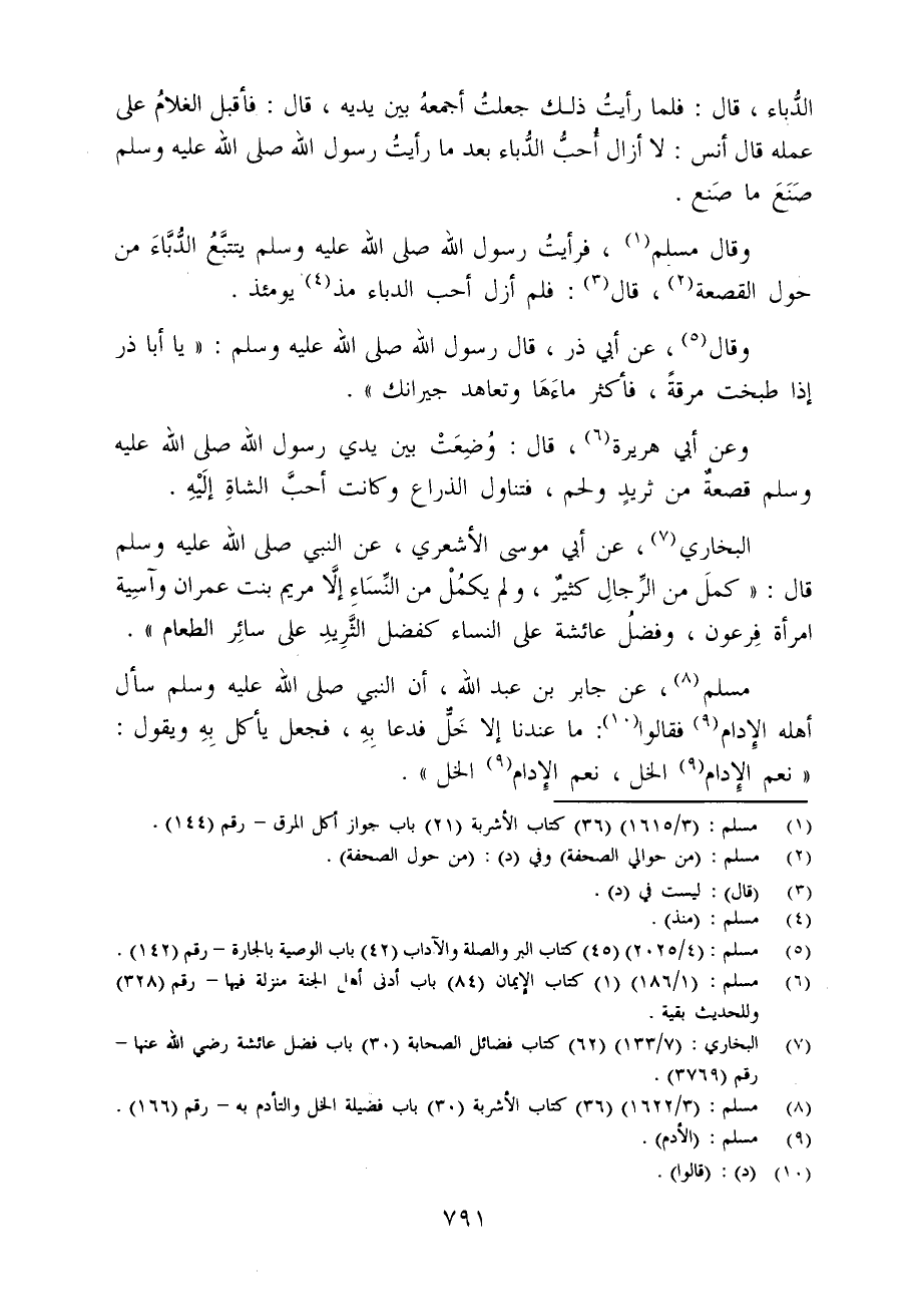وقال مسلم (¬1)، فرأيتُ رسول الله - صلى الله عليه وسلم - يتتبَّعُ الدُّبَّاءَ من حول القصعة (¬2)، قال (¬3): فلم أزل أحب الدباء مذ (¬4) يومئذ.