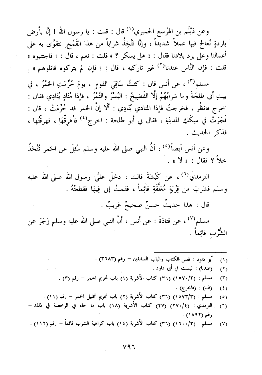 وعن دَيْلَم بن الهرْسع الحميري (¬1) قال: قلت: يا رسول الله! إنَّا بأرض باردةٍ نُعابم فيها عملاً شديداً، وإنَّا نتَّخِذُ شراباً من هذا القَمْحِ نتقوَّى به على أعمالنا وعلى برد بلادنا فقال: "هل يسكر؟ " قلت: نعم، قال: "فاجتنبوه" قلت: فإن النَّاس عندنا (¬2) غير تاركيه، قال: "فإن لم يتركوه قاتلوهم".
