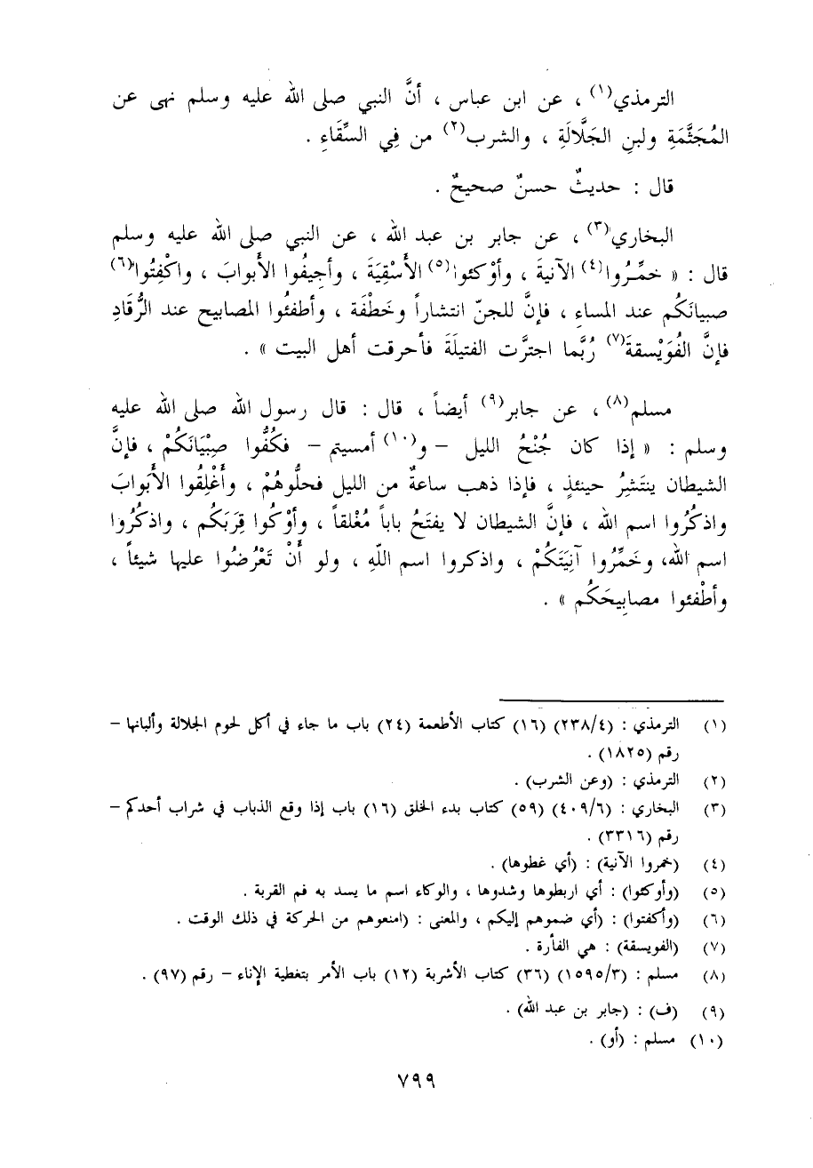 البخاري (¬3)، عن جابر بن عبد الله، عن النبي - صلى الله عليه وسلم - قال: "خمَرُوا (¬4) الآنيةَ، وأوْكئوا (¬5) الأسْقِيَةَ، وأجِيفُوا الأبوابَ، واكْفِتُوا (¬6) صبيانَكُم عند المساءِ، فإنَّ للجنّ انتشاراً وخَطْفَة، وأطفئُوا الصابيح عند الرُّقَادِ فإنَّ الفُوَيْسقةَ (¬7) رُبَّما اجترَّت الفتيلَةَ فأحرقت أهل البيت".