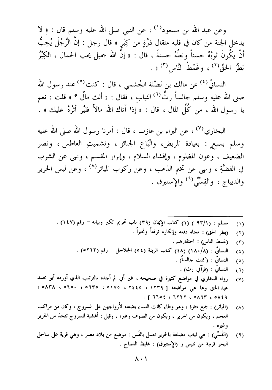وعن عبد الله بن مسعود (¬1)، عن النبي - صلى الله عليه وسلم - قال: "لا يدخل الجنة من كان في قلبه مثقال ذرَّةٍ من كِبْرٍ" قال رجل: إنَّ الرَّجُلَ يُحِبُّ أنْ يكُونَ ثوبُهُ حسنًا ونعلُهُ حسنةً، قال: " إن الله جميل يحب الجمال، الكِبْرُ بَطَرُ الحقَّ (¬2)، وغَمْطُ النَّاسِ (¬3) ".