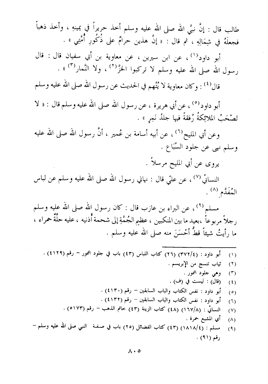 أبو داود (¬1)، عن ابن سيرين، عن معاوية بن أبي سفيان قال: قال رسول الله - صلى الله عليه وسلم - لا تركبوا الخزَّ (¬2)، ولا النَّمار (¬3) ".