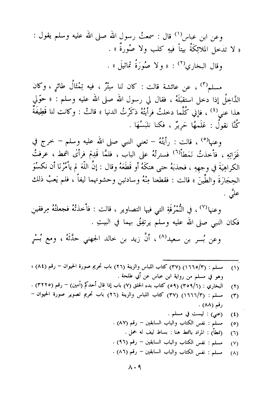 (¬1) مسلم: (3/ 1665) (37) كتاب اللباس والزينة (26) باب تحريم صورة الحيوان - رقم (84)، وهو في مسلم من رواية ابن عباس عن أبي طلحة.