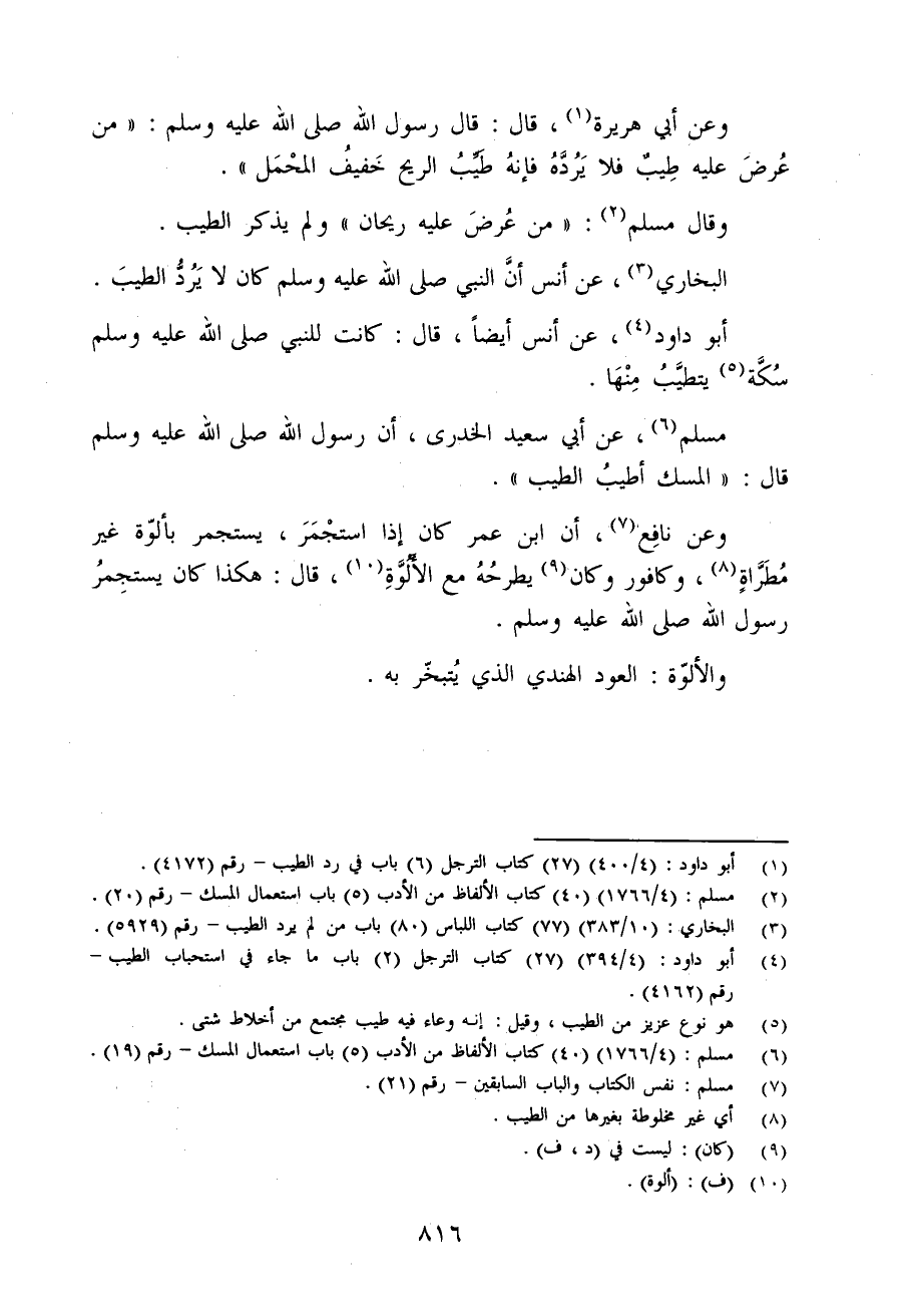 مسلم (¬6)، عن أبي سعيد الخدري، أن رسول الله - صلى الله عليه وسلم - قال: "المسك أطيبُ الطيب".