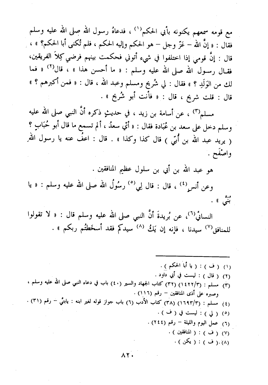 مسلم (¬3)، عن أسامة بن زيد، في حديثٍ ذكره أنَّ النبي - صلى الله عليه وسلم - دخل على سعد بن عُبَادة فقال: "أيْ سعدُ، ألم تسمع ما قال أبو حُبَاب؟ (يريد عبد الله بن أُبيّ) قال كذا وكذا". قال: اعفُ عنه يا رسول الله