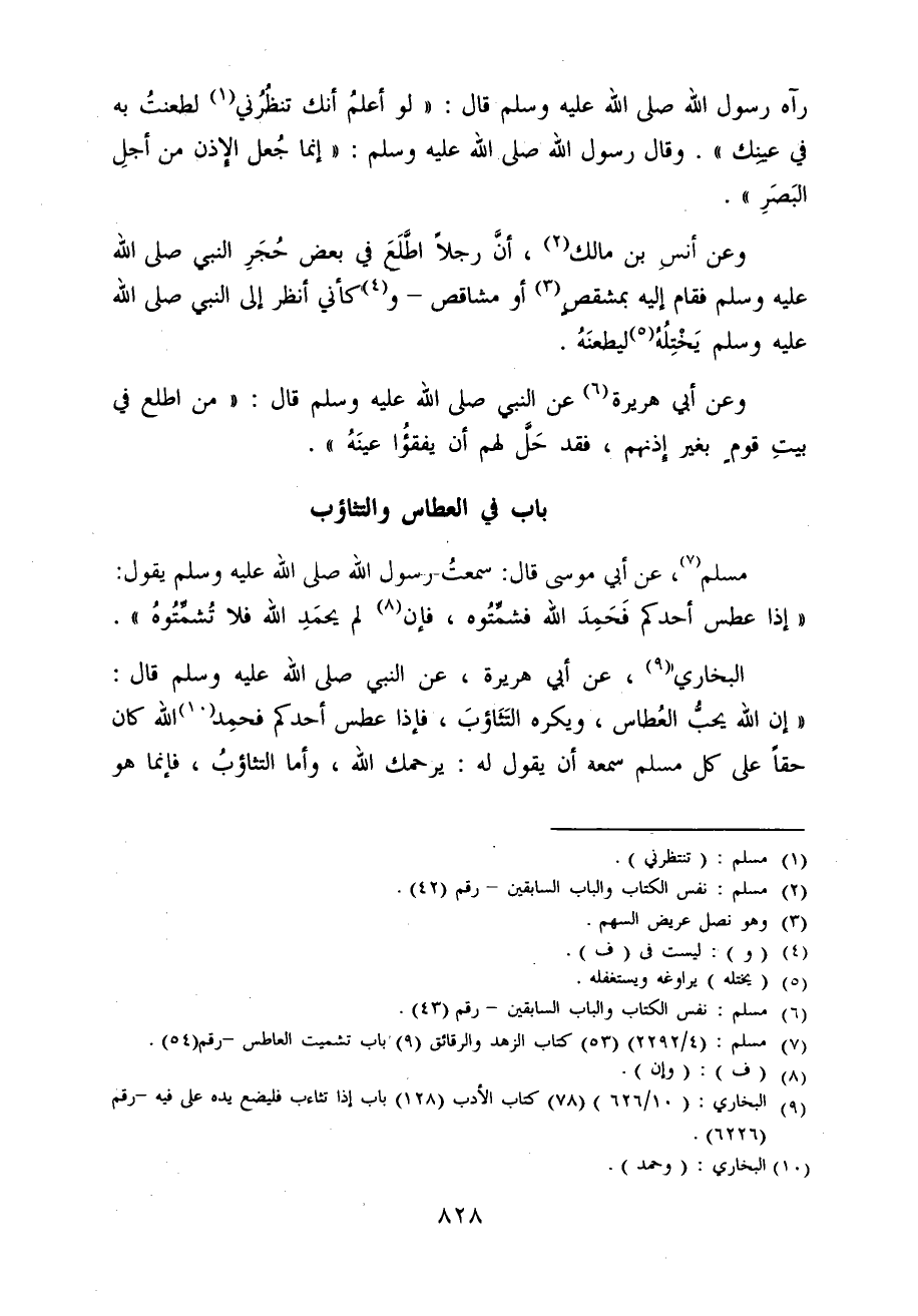 رآه رسول الله - صلى الله عليه وسلم - قال: "لو أعلمُ أنك تنظُرُني (¬1) لطعنتُ به في عينِك". وقال رسول الله - صلى الله عليه وسلم -: "إنما جُعل الإذن من أجلِ البَصَرِ".