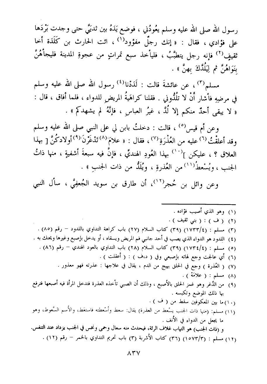 (¬11) مسلم: (منها ذات الجنب يسْعط من العذرة) يقال. سعط وأسعطته فاستعَط، والإسم السَّعوط، وهو ما يجعل من الدواء في الأنف.