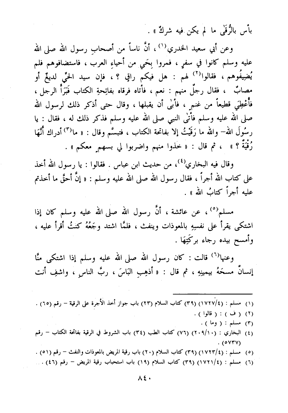 (¬1) مسلم: (4/ 1727) (39) كتاب السلام (23) باب جواز أخذ الأجرة على الرقية - رقم (65).
