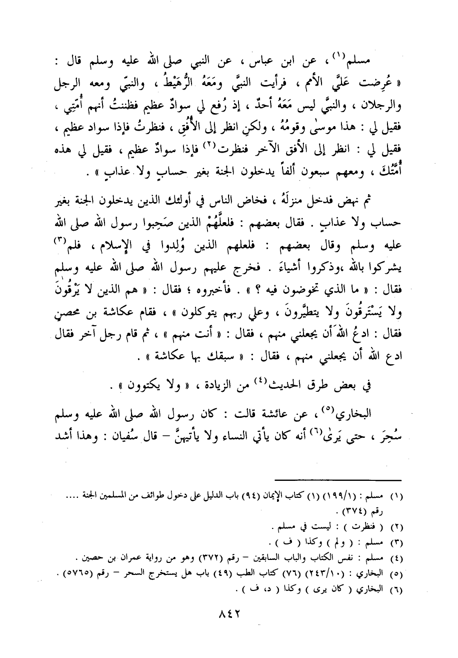 مسلم (¬1)، عن ابن عباس، عن النبي - صلى الله عليه وسلم - قال: "عُرِضت عَليَّ الأمم، فرأيت النبيَّ ومَعَهُ الرُّهَيْطُ، والنبيّ ومعه الرجل والرجلان، والنبيَّ ليس مَعَهُ أحدٌ، إذ رُفع في سوادٌ عظيم فظنتُ أنهم أُمّتِي، فقيل في: هذا موسى وقومُهُ، ولكنِ انظر إلى الأفُقِ، فنظرتُ فإذا سواد عظيم، فقيل لي: انظر إلى الأفق الآخر فنظرت (¬2) فإذا سوادٌ عظيم، فقيل لي هذه أُمَّتُكَ، ومعهم سبعون ألفًا يدخلون الجنة بغير حسابٍ ولا. عذاب".