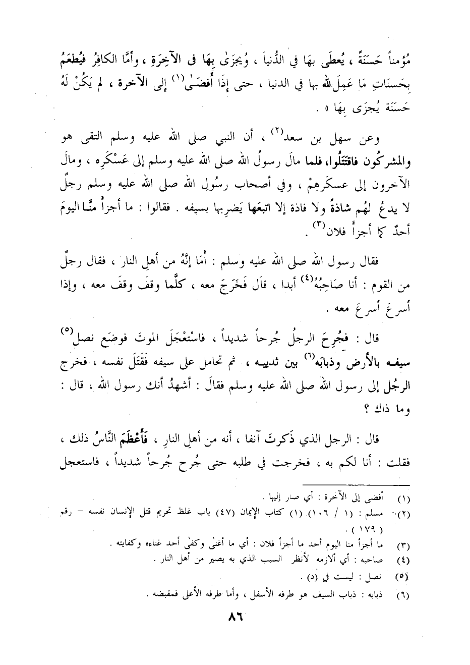 قال: فجُرِحَ الرجلُ جُرحاً شديداً، فاسْتعجَلَ الموتَ فوضَع نصل (¬5) سيفه بالأرض وذبابَه (¬6) بين ثدييه، ثم تحامل على سيفه فَقَتَلَ نفسه، فخرج الرجُل إلى رسول الله - صلى الله عليه وسلم - فقالَ: أشهدُ أنك رسول الله، قال: وما ذاك؟