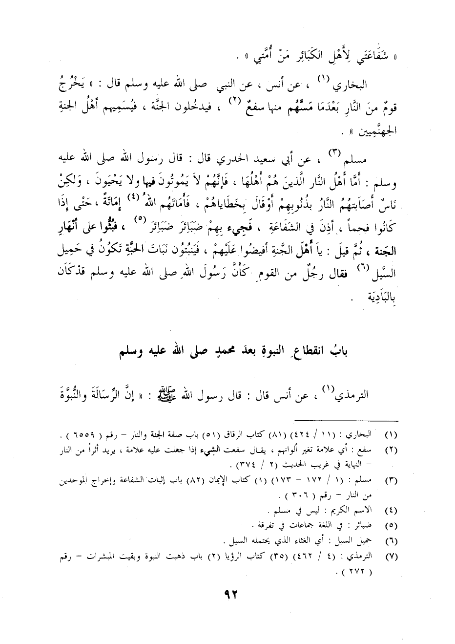 مسلم (¬3)، عن أبي سعيد الخدري قال: قال رسول الله - صلى الله عليه وسلم -: أمَّا أهْلُ النَّار الَّذينَ هُمْ أهْلُهَا، فَإنَّهُم لاَ يَمُوتُونَ فيها ولا يَحْيَوْنَ، وَلكِنْ نَاسٌ أَصَاَبتهُمُ النَّارُ بذُنُوبِهم أَوْ قَالَ بخَطَاياهُم، فَأمَاتَهُم اللهُ (¬4) إمَاتَةً، حَتَّى إِذَا كَانُوا فحماً، أذِنَ في الشَفَاعَةِ، فجِيء بِهِم ضَبَائِرَ ضَبَائِرَ (¬5)، فبُثُّوا على أنْهَارِ الجَنة، ثُمَّ قيلَ: ياَ أهْلَ الجنَّةِ أفيضُوا عَلَيْهمْ، فَيَنبُتوُن نَبَاتَ الحبَّة تَكوُنُ في حَمِيل السَّيل (¬6) فقال رجُلٌ من القومِ كَأَنَّ رَسُولَ اللهِ - صلى الله عليه وسلم - قد كَانَ بِالبَادِيَة.