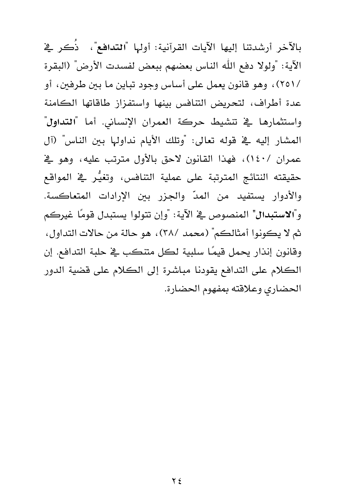بالآخر أرشدتنا إليها الآيات القرآنية: أولها "التدافع"، ذُكر في الآية: "ولولا دفع الله الناس بعضهم ببعض لفسدت الأرض" (البقرة /251)، وهو قانون يعمل على أساس وجود تباين ما بين طرفين، أو عدة أطراف، لتحريض التنافس بينها واستفزاز طاقاتها الكامنة واستثمارها في تنشيط حركة العمران الإنساني. أما "التداول" المشار إليه في قوله تعالى: "وتلك الأيام نداولها بين الناس" (آل عمران /140)، فهذا القانون لاحق بالأول مترتب عليه، وهو في حقيقته النتائج المترتبة على عملية التنافس، وتغيُّر في المواقع والأدوار يستفيد من المدّ والجزر بين الإرادات المتعاكسة. و"الاستبدال" المنصوص في الآية: "وإن تتولوا يستبدل قومًا غيركم ثم لا يكونوا أمثالكم" (محمد /38)، هو حالة من حالات التداول، وقانون إنذار يحمل قيمًا سلبية لكل متنكب في حلبة التدافع. إن الكلام على التدافع يقودنا مباشرة إلى الكلام على قضية الدور الحضاري وعلاقته بمفهوم الحضارة.