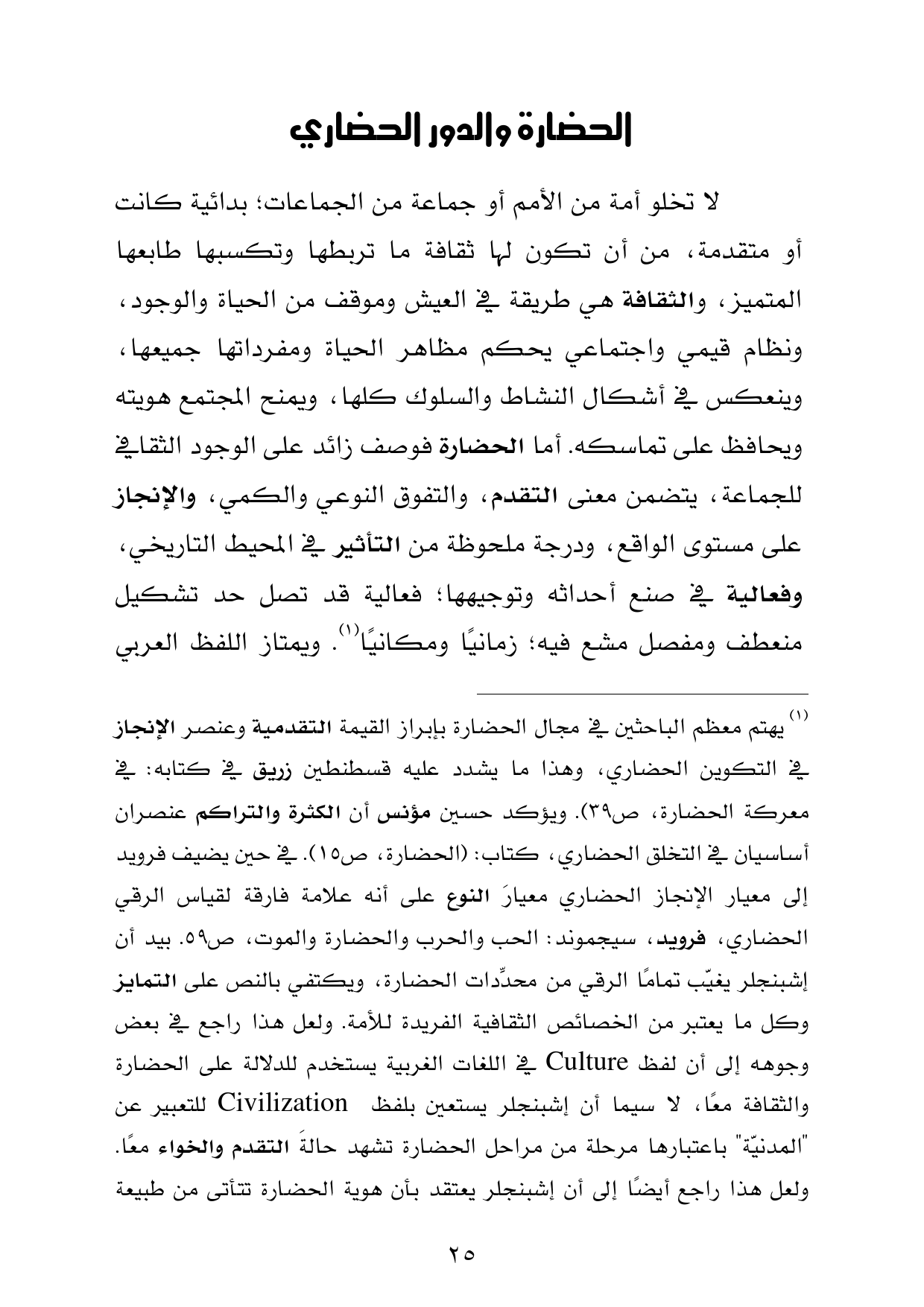 (¬1) يهتم معظم الباحثين في مجال الحضارة بإبراز القيمة التقدمية وعنصر الإنجاز في التكوين الحضاري، وهذا ما يشدد عليه قسطنطين زريق في كتابه: في معركة الحضارة، ص39). ويؤكد حسين مؤنس أن الكثرة والتراكم عنصران أساسيان في التخلق الحضاري، كتاب: (الحضارة، ص15). في حين يضيف فرويد إلى معيار الإنجاز الحضاري معيارَ النوع على أنه علامة فارقة لقياس الرقي الحضاري، فرويد، سيجموند: الحب والحرب والحضارة والموت، ص59. بيد أن إشبنجلر يغيّب تمامًا الرقي من محدِّدات الحضارة، ويكتفي بالنص على التمايز وكل ما يعتبر من الخصائص الثقافية الفريدة للأمة. ولعل هذا راجع في بعض وجوهه إلى أن لفظ Culture في اللغات الغربية يستخدم للدلالة على الحضارة والثقافة معًا، لا سيما أن إشبنجلر يستعين بلفظ Civilization للتعبير عن "المدنيّة" باعتبارها مرحلة من مراحل الحضارة تشهد حالةَ التقدم والخواء معًا. ولعل هذا راجع أيضًا إلى أن إشبنجلر يعتقد بأن هوية الحضارة تتأتى من طبيعة روحها وخصائصها الجوهرية، أما التقدم فهو من علائق المدنية، ينظر كتابه: تدهور الحضارة الغربية.