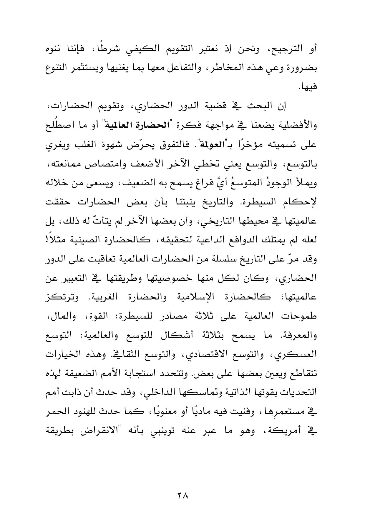 إن البحث في قضية الدور الحضاري، وتقويم الحضارات، والأفضلية يضعنا في مواجهة فكرة "الحضارة العالمية" أو ما اصطُلح على تسميته مؤخرًا بـ"العولمة". فالتفوق يحرّض شهوة الغلب ويغري بالتوسع، والتوسع يعني تخطي الآخر الأضعف وامتصاص ممانعته، ويملأ الوجودُ المتوسعُ أيَّ فراغ يسمح به الضعيف، ويسعى من خلاله لإحكام السيطرة. والتاريخ ينبئنا بأن بعض الحضارات حققت عالميتها في محيطها التاريخي، وأن بعضها الآخر لم يتأتّ له ذلك، بل لعله لم يمتلك الدوافع الداعية لتحقيقه، كالحضارة الصينية مثلاً! وقد مرّ على التاريخ سلسلة من الحضارات العالمية تعاقبت على الدور الحضاري، وكان لكل منها خصوصيتها وطريقتها في التعبير عن عالميتها؛ كالحضارة الإسلامية والحضارة الغربية. وترتكز طموحات العالمية على ثلاثة مصادر للسيطرة: القوة، والمال، والمعرفة. ما يسمح بثلاثة أشكال للتوسع والعالمية: التوسع العسكري، والتوسع الاقتصادي، والتوسع الثقافي. وهذه الخيارات تتقاطع ويعين بعضها على بعض. وتتحدد استجابة الأمم الضعيفة لهذه التحديات بقوتها الذاتية وتماسكها الداخلي، وقد حدث أن ذابت أمم في مستعمرِها، وفنيت فيه ماديًا أو معنويًا، كما حدث للهنود الحمر في أمريكة، وهو ما عبر عنه توينبي بأنه "الانقراض بطريقة