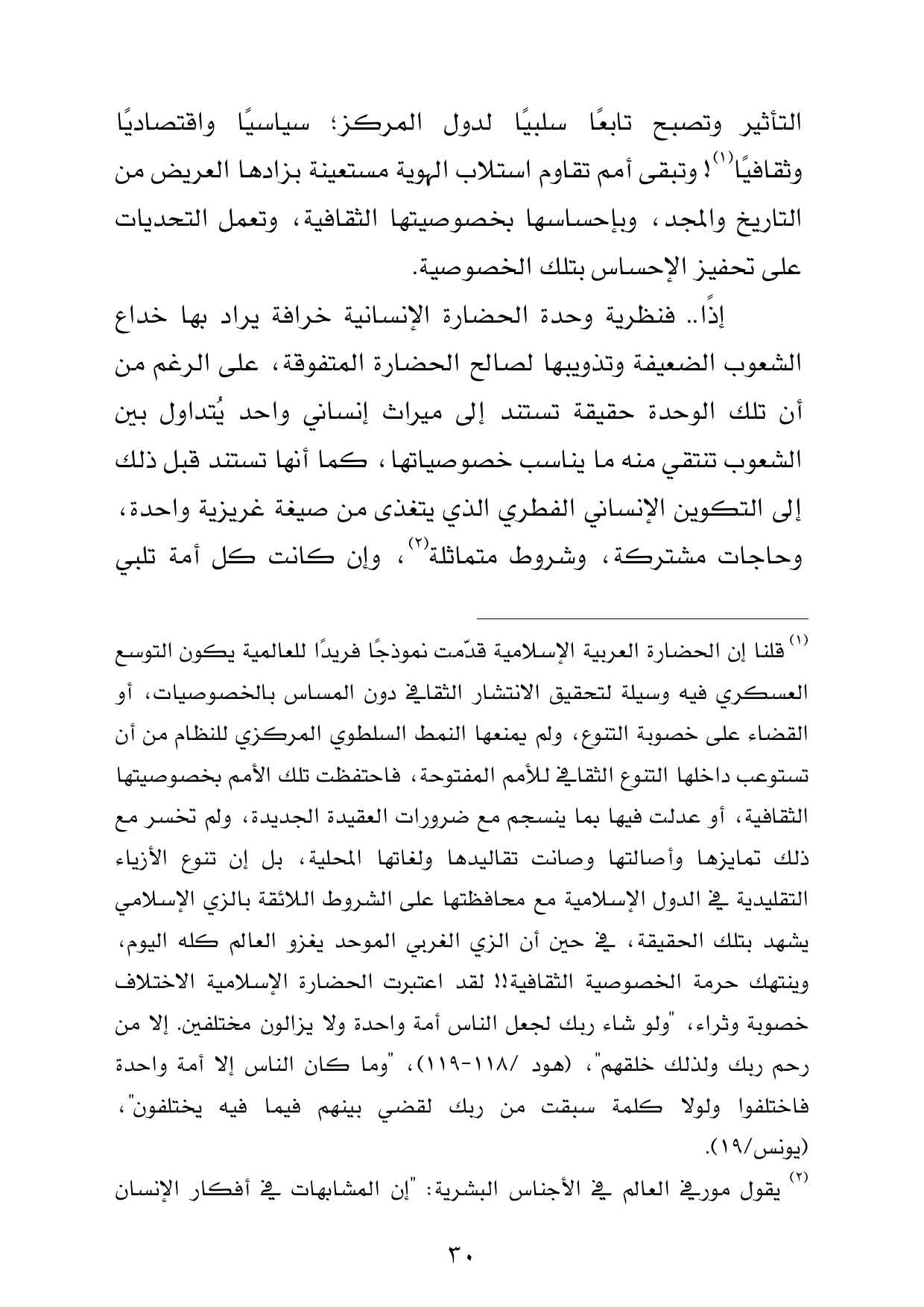 (¬1) قلنا إن الحضارة العربية الإسلامية قدّمت نموذجًا فريدًا للعالمية يكون التوسع العسكري فيه وسيلة لتحقيق الانتشار الثقافي دون المساس بالخصوصيات، أو القضاء على خصوبة التنوع، ولم يمنعها النمط السلطوي المركزي للنظام من أن تستوعب داخلها التنوع الثقافي للأمم المفتوحة، فاحتفظت تلك الأمم بخصوصيتها الثقافية، أو عدلت فيها بما ينسجم مع ضرورات العقيدة الجديدة، ولم تخسر مع ذلك تمايزها وأصالتها وصانت تقاليدها ولغاتها المحلية، بل إن تنوع الأزياء التقليدية في الدول الإسلامية مع محافظتها على الشروط اللائقة بالزي الإسلامي يشهد بتلك الحقيقة، في حين أن الزي الغربي الموحد يغزو العالم كله اليوم، وينتهك حرمة الخصوصية الثقافية!! لقد اعتبرت الحضارة الإسلامية الاختلاف خصوبة وثراء، "ولو شاء ربك لجعل الناس أمة واحدة ولا يزالون مختلفين. إلا من رحم ربك ولذلك خلقهم"، (هود /118 - 119)، "وما كان الناس إلا أمة واحدة فاختلفوا ولولا كلمة سبقت من ربك لقضي بينهم فيما فيه يختلفون"، (يونس/19).