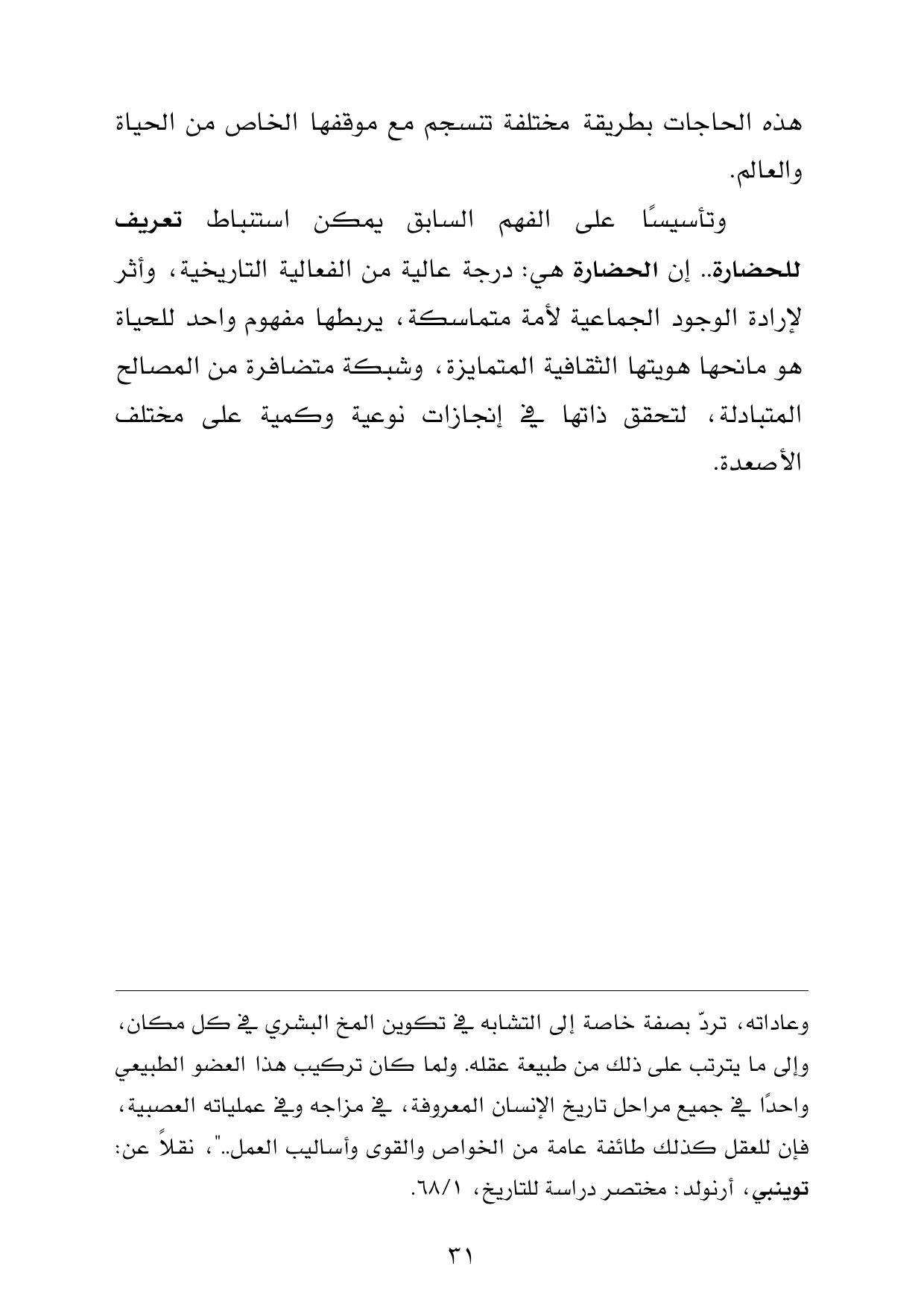 وتأسيسًا على الفهم السابق يمكن استنباط تعريف للحضارة .. إن الحضارة هي: درجة عالية من الفعالية التاريخية، وأثر لإرادة الوجود الجماعية لأمة متماسكة، يربطها مفهوم واحد للحياة هو مانحها هويتها الثقافية المتمايزة، وشبكة متضافرة من المصالح المتبادلة، لتحقق ذاتها في إنجازات نوعية وكمية على مختلف الأصعدة.