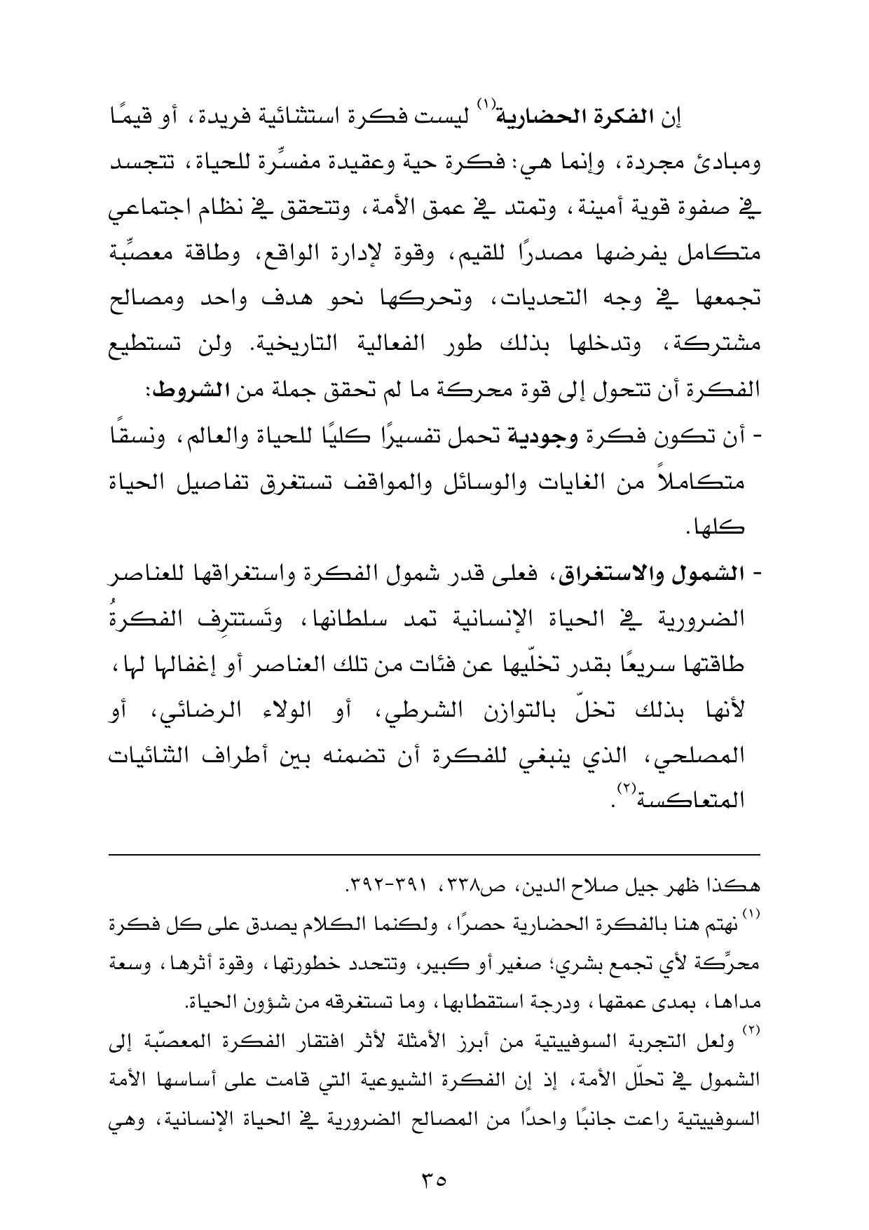 (¬1) نهتم هنا بالفكرة الحضارية حصرًا، ولكنما الكلام يصدق على كل فكرة محرِّكة لأي تجمع بشري؛ صغير أو كبير، وتتحدد خطورتها، وقوة أثرها، وسعة مداها، بمدى عمقها، ودرجة استقطابها، وما تستغرقه من شؤون الحياة.