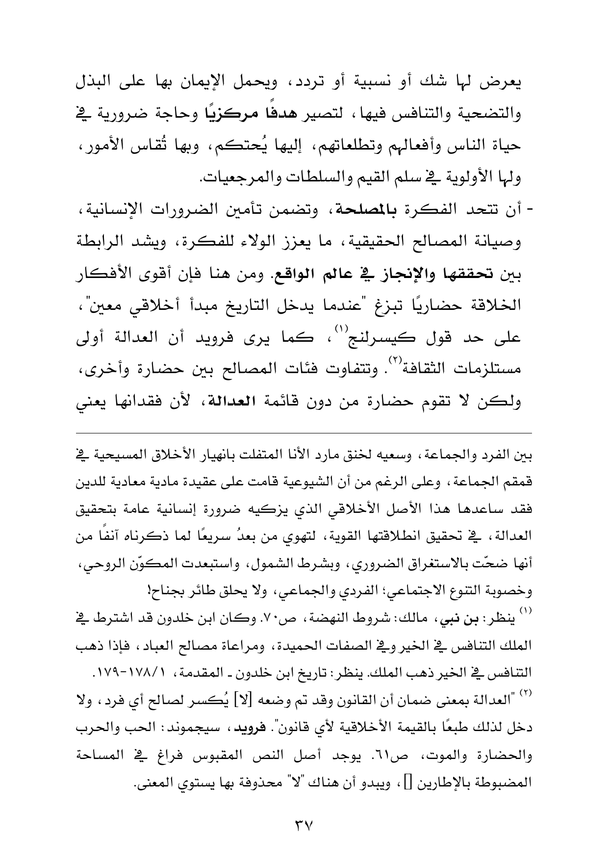 يعرض لها شك أو نسبية أو تردد، ويحمل الإيمان بها على البذل والتضحية والتنافس فيها، لتصير هدفًا مركزيًا وحاجة ضرورية في حياة الناس وأفعالهم وتطلعاتهم، إليها يُحتكم، وبها تُقاس الأمور، ولها الأولوية في سلم القيم والسلطات والمرجعيات.