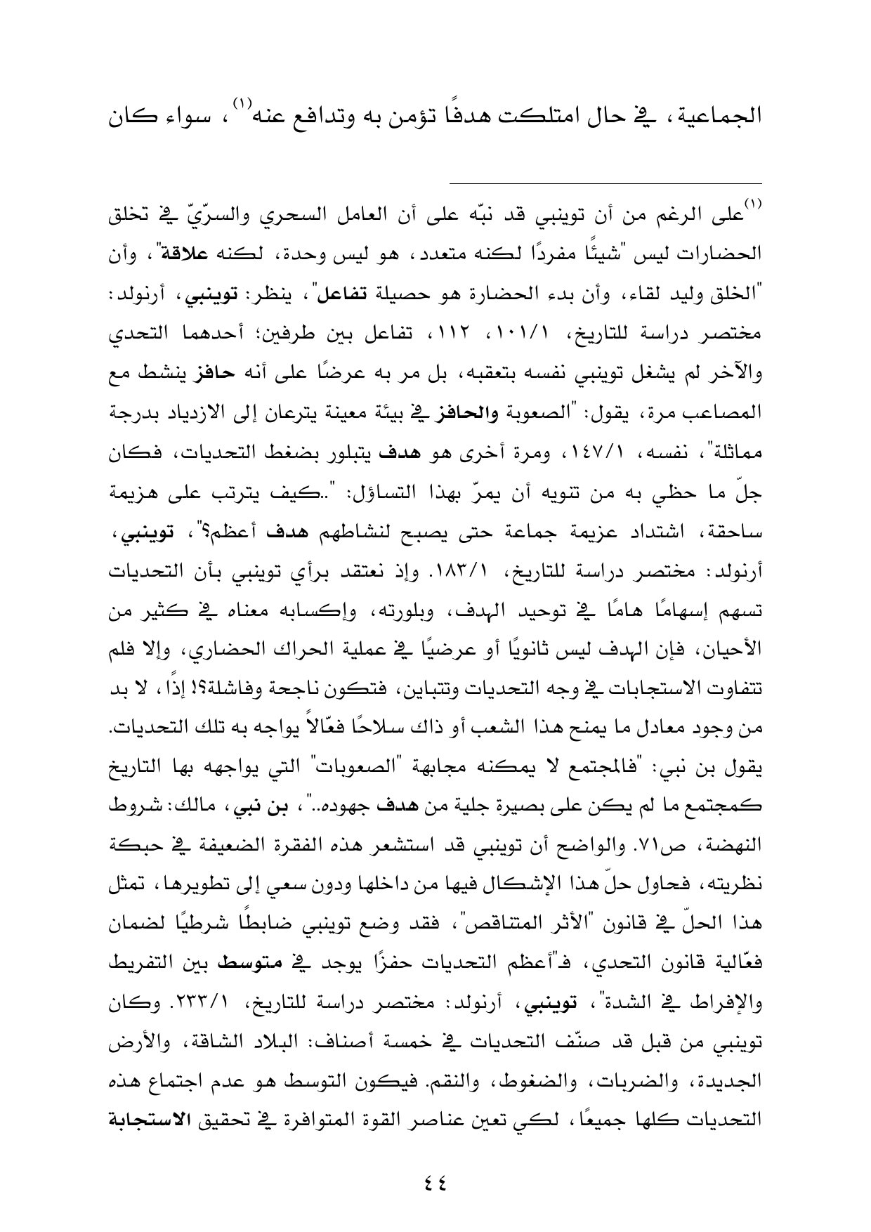 (¬1) على الرغم من أن توينبي قد نبّه على أن العامل السحري والسرّيّ في تخلق الحضارات ليس "شيئًا مفردًا لكنه متعدد، هو ليس وحدة، لكنه علاقة"، وأن "الخلق وليد لقاء، وأن بدء الحضارة هو حصيلة تفاعل"، ينظر: توينبي، أرنولد: مختصر دراسة للتاريخ، 1/ 101، 112، تفاعل بين طرفين؛ أحدهما التحدي والآخر لم يشغل توينبي نفسه بتعقبه، بل مر به عرضًا على أنه حافز ينشط مع المصاعب مرة، يقول: "الصعوبة والحافز في بيئة معينة ينزعان إلى الازدياد بدرجة مماثلة"، نفسه، 1/ 147، ومرة أخرى هو هدف يتبلور بضغط التحديات، فكان جلّ ما حظي به من تنويه أن يمرّ بهذا التساؤل: " .. كيف يترتب على هزيمة ساحقة، اشتداد عزيمة جماعة حتى يصبح لنشاطهم هدف أعظم؟ "، توينبي، أرنولد: مختصر دراسة للتاريخ، 1/ 183. وإذ نعتقد برأي توينبي بأن التحديات تسهم إسهامًا هامًا في توحيد الهدف، وبلورته، وإكسابه معناه في كثير من الأحيان، فإن الهدف ليس ثانويًا أو عرضيًا في عملية الحراك الحضاري، وإلا فلم تتفاوت الاستجابات في وجه التحديات وتتباين، فتكون ناجحة وفاشلة؟! إذًا، لا بد من وجود معادل ما يمنح هذا الشعب أو ذاك سلاحًا فعّالاً يواجه به تلك التحديات. يقول بن نبي: "فالمجتمع لا يمكنه مجابهة "الصعوبات" التي يواجهه بها التاريخ كمجتمع ما لم يكن على بصيرة جلية من هدف جهوده .. "، بن نبي، مالك: شروط النهضة، ص71 .. والواضح أن توينبي قد استشعر هذه الفقرة الضعيفة في حبكة نظريته، فحاول حلّ هذا الإشكال فيها من داخلها ودون سعي إلى تطويرها، تمثل هذا الحلّ في قانون "الأثر المتناقص"، فقد وضع توينبي ضابطًا شرطيًا لضمان فعّالية قانون التحدي، فـ"أعظم التحديات حفزًا يوجد في متوسط بين التفريط والإفراط في الشدة"، توينبي، أرنولد: مختصر دراسة للتاريخ، 1/ 233. وكان توينبي من قبل قد صنّف التحديات في خمسة أصناف: البلاد الشاقة، والأرض الجديدة، والضربات، والضغوط، والنقم. فيكون التوسط هو عدم اجتماع هذه التحديات كلها جميعًا، لكي تعين عناصر القوة المتوافرة في تحقيق الاستجابة الظافرة.