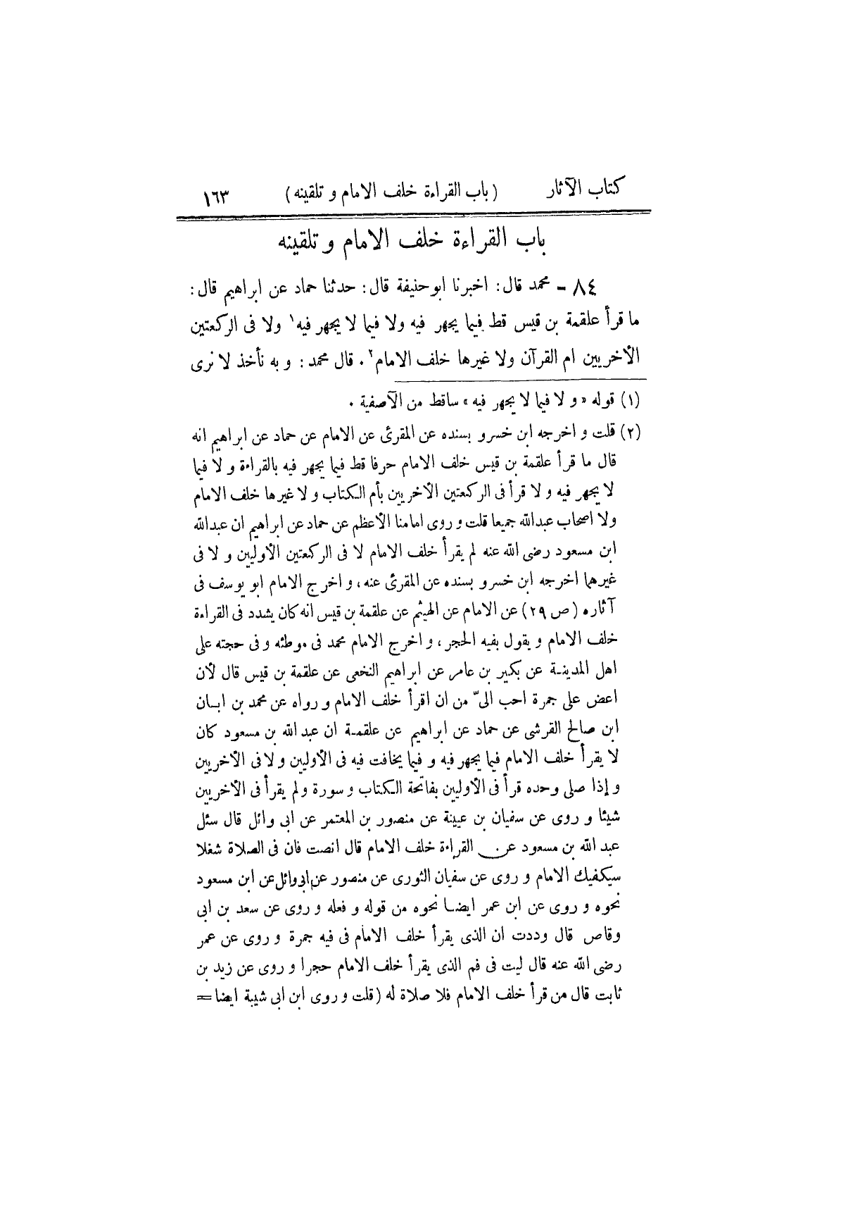 ٨٤ - مُحَمَّدٌ، قَالَ: أَخْبَرَنَا أَبُو حَنِيفَةَ، قَالَ حَدَّثَنَا حَمَّادٌ، عَنْ إِبْرَاهِيمَ، قَالَ: «مَا قَرَأَ عَلْقَمَةُ بْنُ قَيْسٍ قَطُّ فِيمَا يُجْهَرُ فِيهِ، وَلَا فِيمَا لَا يُجْهَرُ فِيهِ، وَلَا فِي الرَّكْعَتَيْنِ الْأُخْرَيَيْنِ أُمَّ الْقُرْآنِ، وَلَا غَيْرَهَا خَلْفَ الْإِمَامِ» قَالَ مُحَمَّدٌ: وَبِهِ نَأْخُذُ. لَا نَرَى ⦗١٦٤⦘ الْقِرَاءَةَ خَلْفَ الْإِمَامِ فِي شَيْءٍ مِنَ الصَّلَاةِ يُجْهَرُ فِيهِ أَوْ لَا يُجْهَرُ فِيهِ
