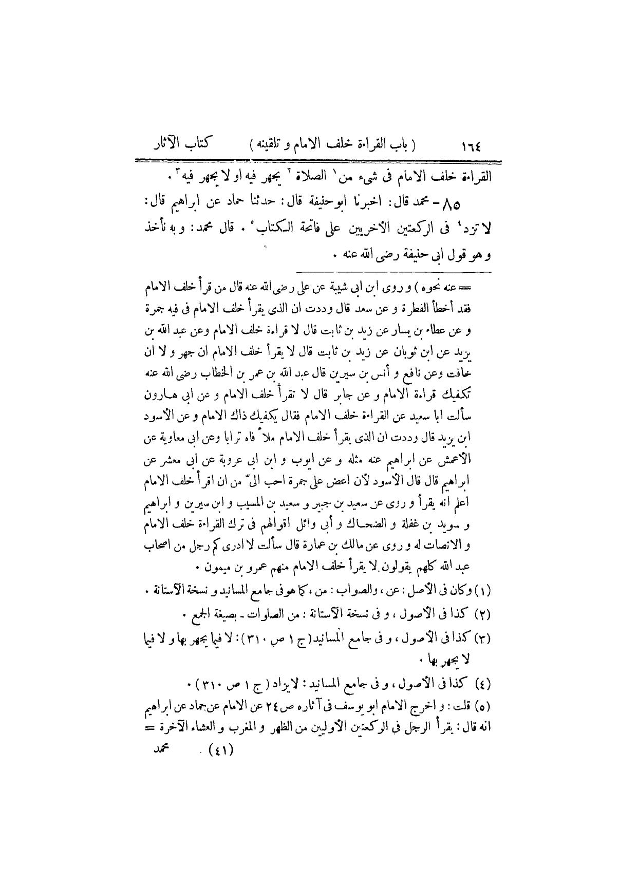 ٨٥ - مُحَمَّدٌ، قَالَ: أَخْبَرَنَا أَبُو حَنِيفَةَ، قَالَ حَدَّثَنَا حَمَّادٌ، عَنْ إِبْرَاهِيمَ، قَالَ: «لَا تُزِدْ فِي الرَّكْعَتَيْنِ الْأُخْرَيَيْنِ عَلَى فَاتِحَةِ الْكِتَابِ» قَالَ مُحَمَّدٌ: وَبِهِ نَأْخُذُ، وَهُوَ قَوْلُ أَبِي حَنِيفَةَ رَضِيَ اللَّهُ عَنْهُ