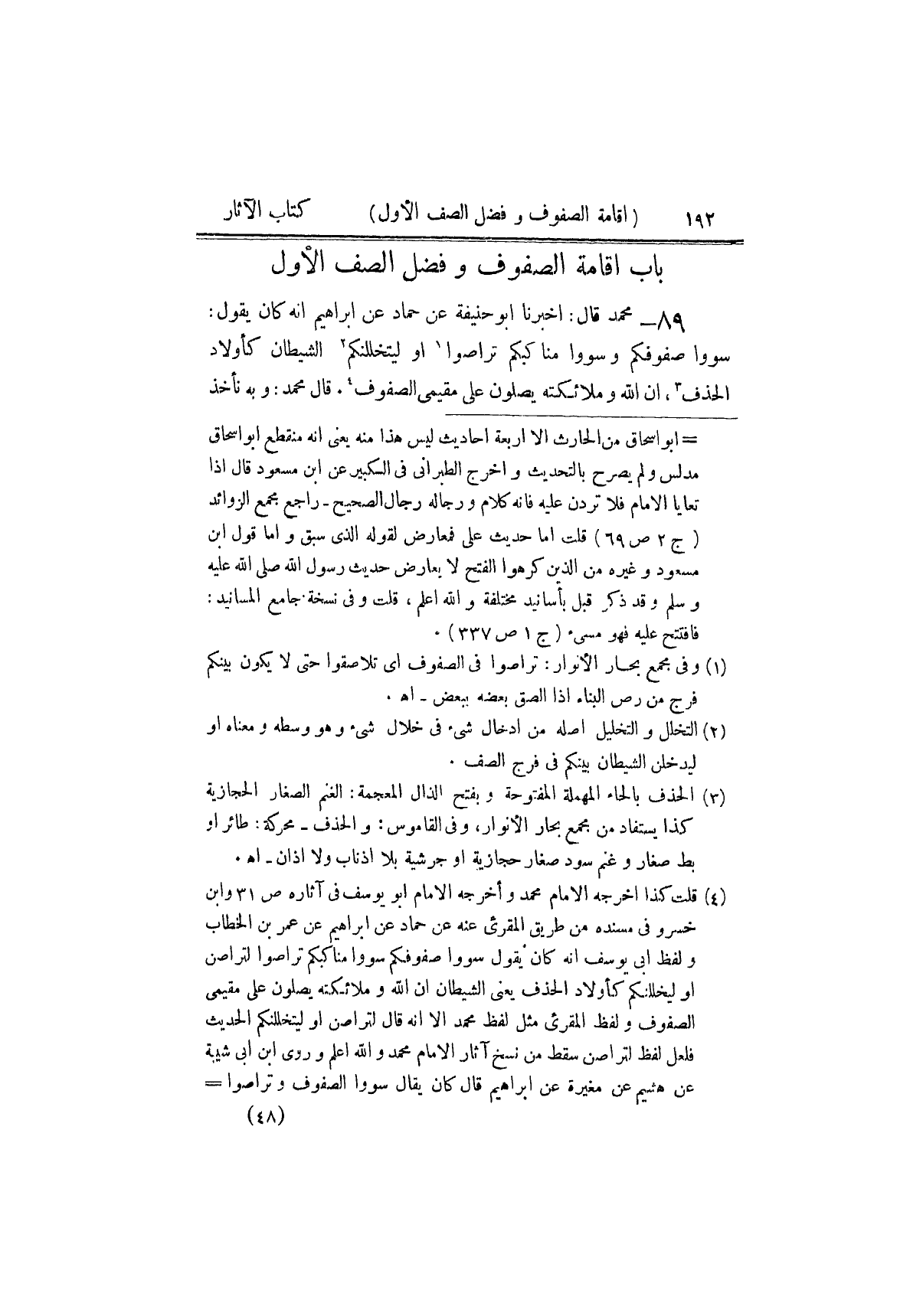 ٨٩ - مُحَمَّدٌ، قَالَ: أَخْبَرَنَا أَبُو حَنِيفَةَ، عَنْ حَمَّادٍ، عَنْ إِبْرَاهِيمَ، أَنَّهُ كَانَ يَقُولُ «سَوُّوا صُفُوفَكُمْ، وَسَوُّوا مَنَاكِبَكُمْ، تَرَاصُّوا أَوْ لَيَتَخَلَّلَنَّكُمُ الشَّيْطَانُ كَأَوْلَادِ الْحَذَفِ، إِنَّ اللَّهَ وَمَلَائِكَتَهُ يُصَلُّونَ عَلَى مُقِيمِي الصُّفُوفِ» قَالَ مُحَمَّدٌ: وَبِهِ نَأْخُذُ ⦗١٩٤⦘، لَا يَنْبَغِي أَنْ يُتْرَكَ الصَّفُّ، وَفِيهِ الْخَلَلُ حَتَّى يُسَوُّوا. وَهُوَ قَوْلُ أَبِي حَنِيفَةَ رَضِيَ اللَّهُ عَنْهُ