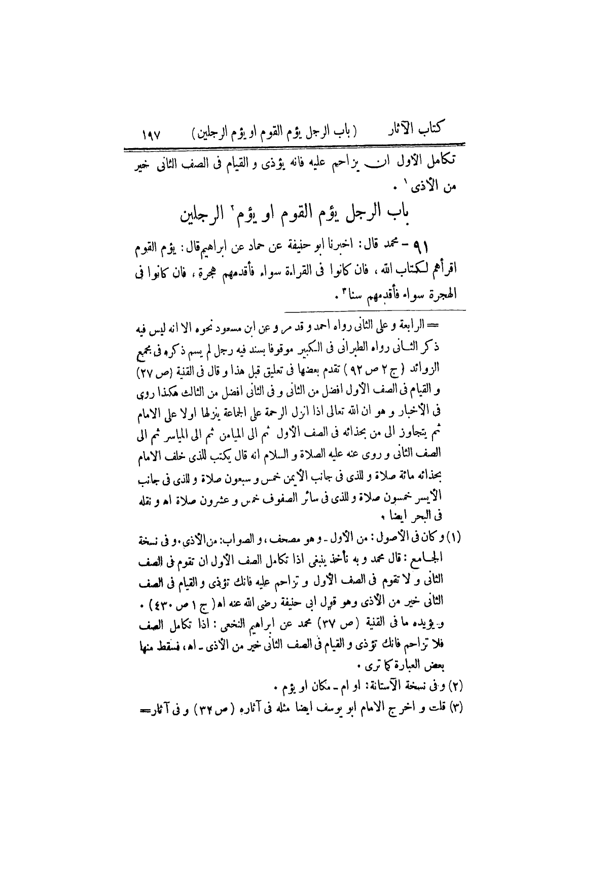 ٩١ - مُحَمَّدٌ، قَالَ: أَخْبَرَنَا أَبُو حَنِيفَةَ، عَنْ حَمَّادٍ، عَنْ إِبْرَاهِيمَ، قَالَ: «يَؤُمُّ الْقَوْمَ أَقْرؤُهُمْ لِكِتَابِ اللَّهِ، فَإِنْ كَانُوا فِي الْقِرَاءَةِ سَوَاءً فَأَقْدَمُهُمْ هِجْرَةً، فَإِنْ كَانُوا فِي الْهِجْرَةِ سَوَاءً فَأَقْدَمُهُمْ سِنًّا» ⦗١٩٨⦘ قَالَ مُحَمَّدٌ: وَبِهِ نَأْخُذُ، وَإِنَّمَا قِيلَ: أَقْرؤُهُمْ لِكِتَابِ اللَّهِ؛ لِأَنَّ النَّاسَ كَانُوا فِي ذَلِكَ الزَّمَانِ أَقْرَؤُهُمْ لِلْقُرْآنِ أَفْقَهُهُمْ فِي الدِّينِ، فَإِذَا كَانُوا فِي هَذَا الزَّمَانِ عَلَى ذَلِكَ، فَلْيَؤُمَّهُمْ أَقْرَؤُهُمْ، فَإِنْ كَانَ غَيْرُهُ أَفْقَهَ مِنْهُ، وَأَعْلَمَ بِسُنَّةِ الصَّلَاةِ، وَهُوَ يَقْرَأُ نَحْوًا مِنْ قِرَاءَتِهِ، فَأَفْقَهُّمَا وَأَعْلَمُهُمَا بِسُنَّةِ الصَّلَاةِ أَوْلَاهُمَا بِالْإِمَامَةِ. وَهُوَ ⦗٢٠٢⦘ قَوْلُ أَبِي حَنِيفَةَ رَضِيَ اللَّهُ عَنْهُ