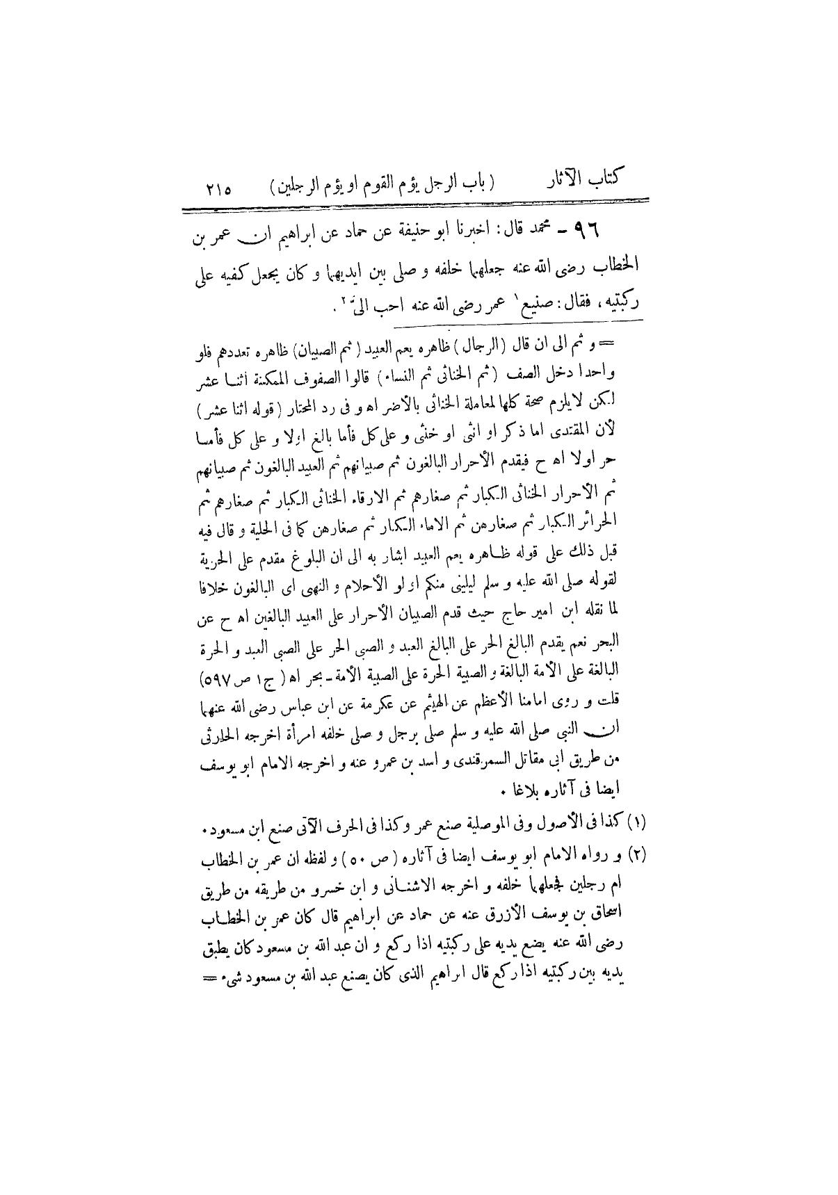 ٩٦ - مُحَمَّدٌ، قَالَ: أَخْبَرَنَا أَبُو حَنِيفَةَ، عَنْ حَمَّادٍ، عَنْ إِبْرَاهِيمَ، أَنَّ عُمَرَ بْنَ الْخَطَّابِ رَضِيَ اللَّهُ عَنْهُ " جَعَلَهُمَا خَلْفَهُ، وَصَلَّى بَيْنَ أَيْدِيهِمَا، وَكَانَ يَجْعَلُ كَفَّيْهِ عَلَى رُكْبَتَيْهِ، فَقَالَ: صَنِيعُ عُمَرَ رَضِيَ اللَّهُ عَنْهُ أَحَبُّ إِلَيَّ " ⦗٢١٧⦘ قَالَ مُحَمَّدٌ: وَبِهِ نَأْخُذُ، وَهُوَ أَحَبُّ إِلَيْنَا مِنْ صَنِيعِ ابْنِ مَسْعُودٍ رَضِيَ اللَّهُ عَنْهُ. وَهُوَ قَوْلُ أَبِي حَنِيفَةَ رَضِيَ اللَّهُ عَنْهُ