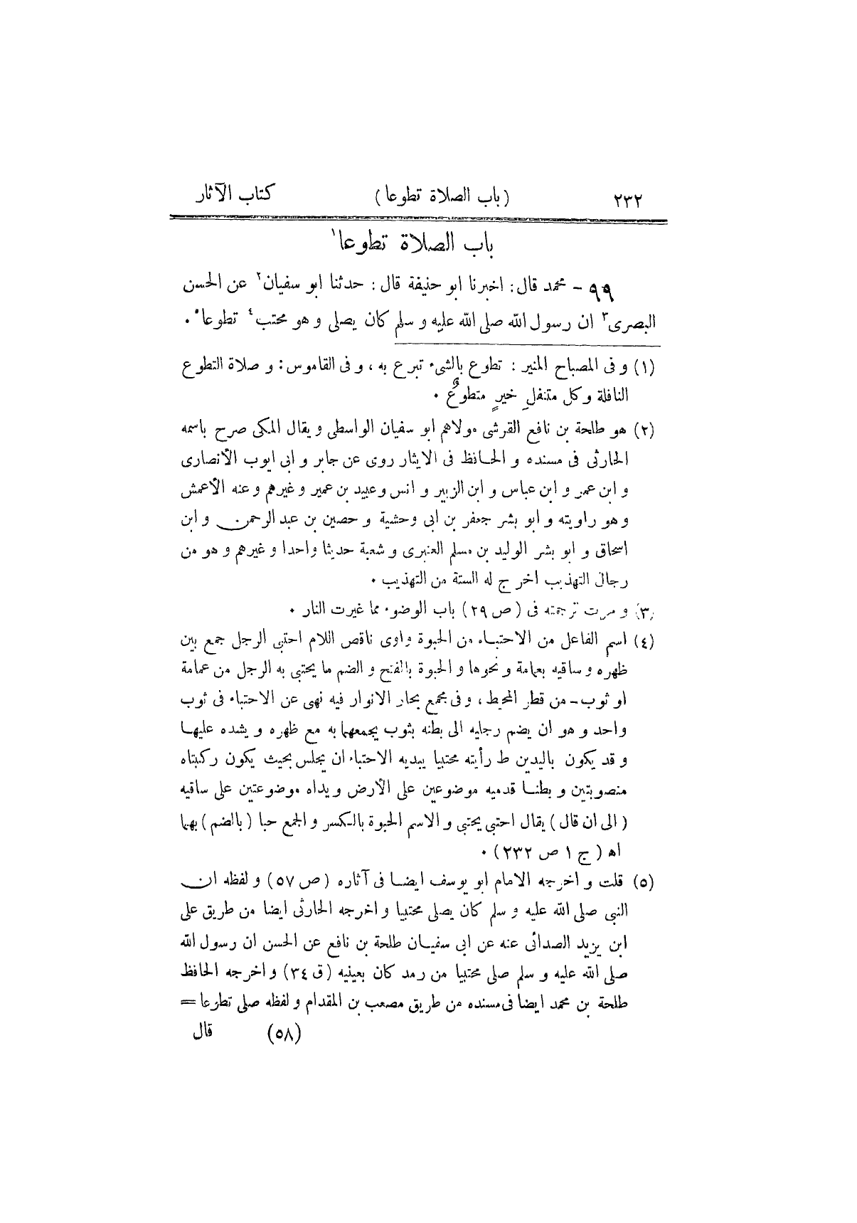 ٩٩ - مُحَمَّدٌ، قَالَ: أَخْبَرَنَا أَبُو حَنِيفَةَ، قَالَ حَدَّثَنَا أَبُو سُفْيَانَ، عَنِ الْحَسَنِ الْبَصْرِيِّ، أَنَّ رَسُولَ اللَّهِ صَلَّى اللهُ عَلَيْهِ وَسَلَّمَ كَانَ يُصَلِّي وَهُوَ مُحْتَبٍ تَطَوُّعًا ⦗٢٣٣⦘ قَالَ مُحَمَّدٌ: وَبِهِ نَأْخُذُ، لَا نَرَى بَأْسًا بِذَلِكَ، فَإِذَا بَلَغَ السُّجُودَ حَلَّ حَبْوَتَهُ وَهَذَا قَوْلُ أَبِي حَنِيفَةَ رَضِيَ اللَّهُ عَنْهُ