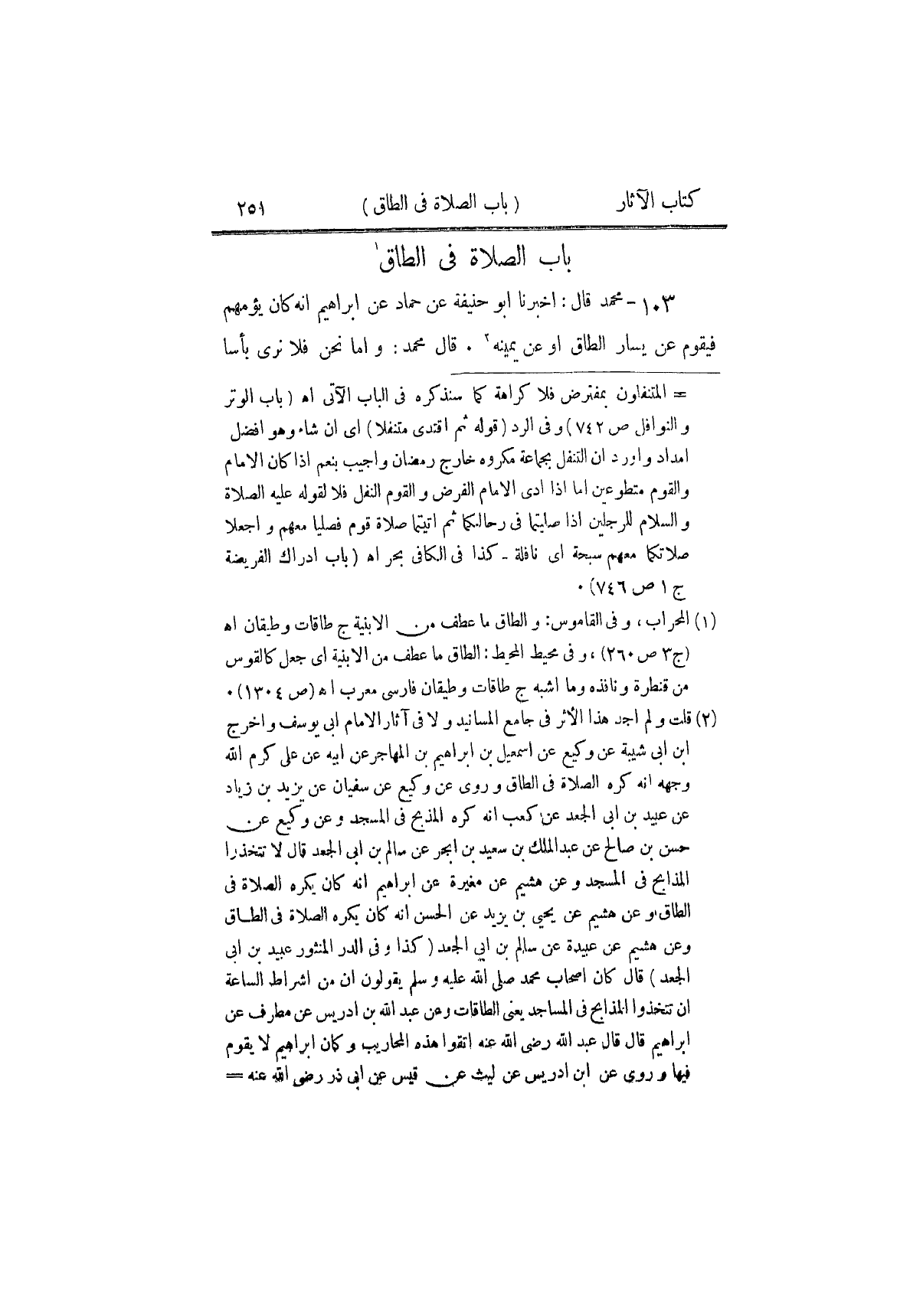 ١٠٣ - مُحَمَّدٌ، قَالَ: أَخْبَرَنَا أَبُو حَنِيفَةَ، عَنْ حَمَّادٍ، عَنْ إِبْرَاهِيمَ، أَنَّهُ كَانَ يَؤُمُّهُمْ فَيَقُومُ عَنْ يَسَارِ الطَّاقِ، أَوْ عَنْ يَمِينِهِ " قَالَ مُحَمَّدٌ: وَأَمَّا نَحْنُ فَلَا نَرَى بَأْسًا ⦗٢٥٤⦘ أَنْ يَقُومَ بِحِيَالِ الطَّاقِ مَا لَمْ يَدْخُلْ فِيهِ إِذَا كَانَ مَقَامُهُ خَارِجًا مِنْهُ، وَسُجُودُهُ فِيهِ. وَهُوَ قَوْلُ أَبِي حَنِيفَةَ رَضِيَ اللَّهُ عَنْهُ
