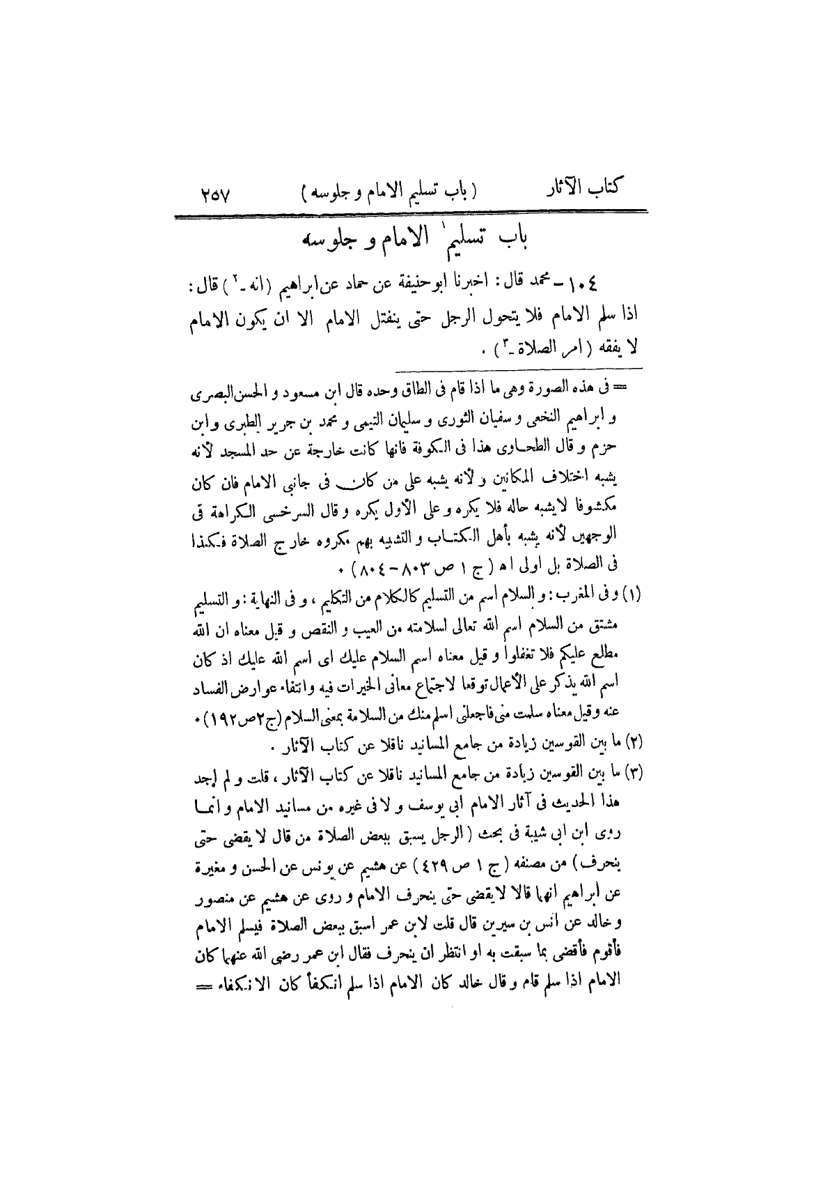 ١٠٤ - مُحَمَّدٌ، قَالَ: أَخْبَرَنَا أَبُو حَنِيفَةَ، عَنْ حَمَّادٍ، عَنْ إِبْرَاهِيمَ، أَنَّهُ قَالَ: «إِذَا سَلَّمَ الْإِمَامُ فَلَا يَتَحَوَّلِ الرَّجُلُ حَتَّى يَنْفَتِلَ الْإِمَامُ إِلَّا أَنْ يَكُونَ الْإِمَامُ لَا يَفْقَهُ أَمَرَ الصَّلَاةِ» ⦗٢٥٩⦘ قَالَ مُحَمَّدٌ: وَبِهِ نَأْخُذُ؛ لِأَنَّهُ لَا يَدْرِي لَعَلَّ عَلَيْهِ سَجْدَتَيِ السَّهْوِ، فَإِذَا كَانَ مِمَّنْ لَا يَفْقَهُ أَمْرَ الصَّلَاةِ فَلَا بَأْسَ بِالِانْفِتَالِ، وَهُوَ قَوْلُ أَبِي حَنِيفَةَ رَضِيَ اللَّهُ عَنْهُ