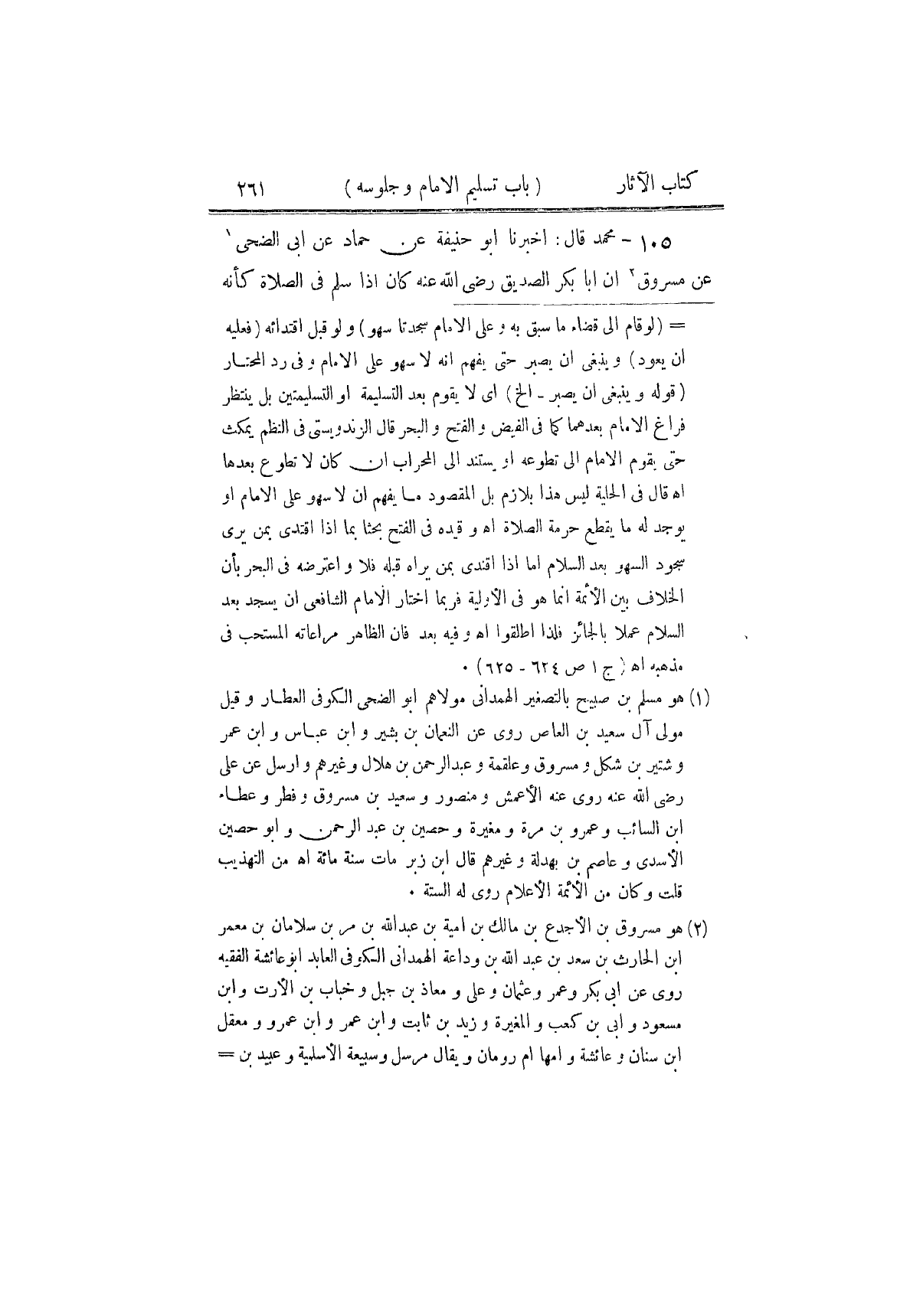 ١٠٥ - مُحَمَّدٌ، قَالَ: أَخْبَرَنَا أَبُو حَنِيفَةَ، عَنْ حَمَّادٍ، عَنْ أَبِي الضُّحَى، عَنْ مَسْرُوقٍ، أَنَّ أَبَا بَكْرٍ الصِّدِّيقَ رَضِيَ اللَّهُ عَنْهُ كَانَ «إِذَا سَلَّمَ فِي الصَّلَاةِ، كَأَنَّهُ ⦗٢٦٢⦘ عَلَى الرَّضْفِ حَتَّى يَنْفَتِلَ» ⦗٢٧٢⦘ قَالَ مُحَمَّدٌ: وَبِهِ نَأْخُذُ، وَهُوَ قَوْلُ أَبِي حَنِيفَةَ رَضِيَ اللَّهُ عَنْهُ