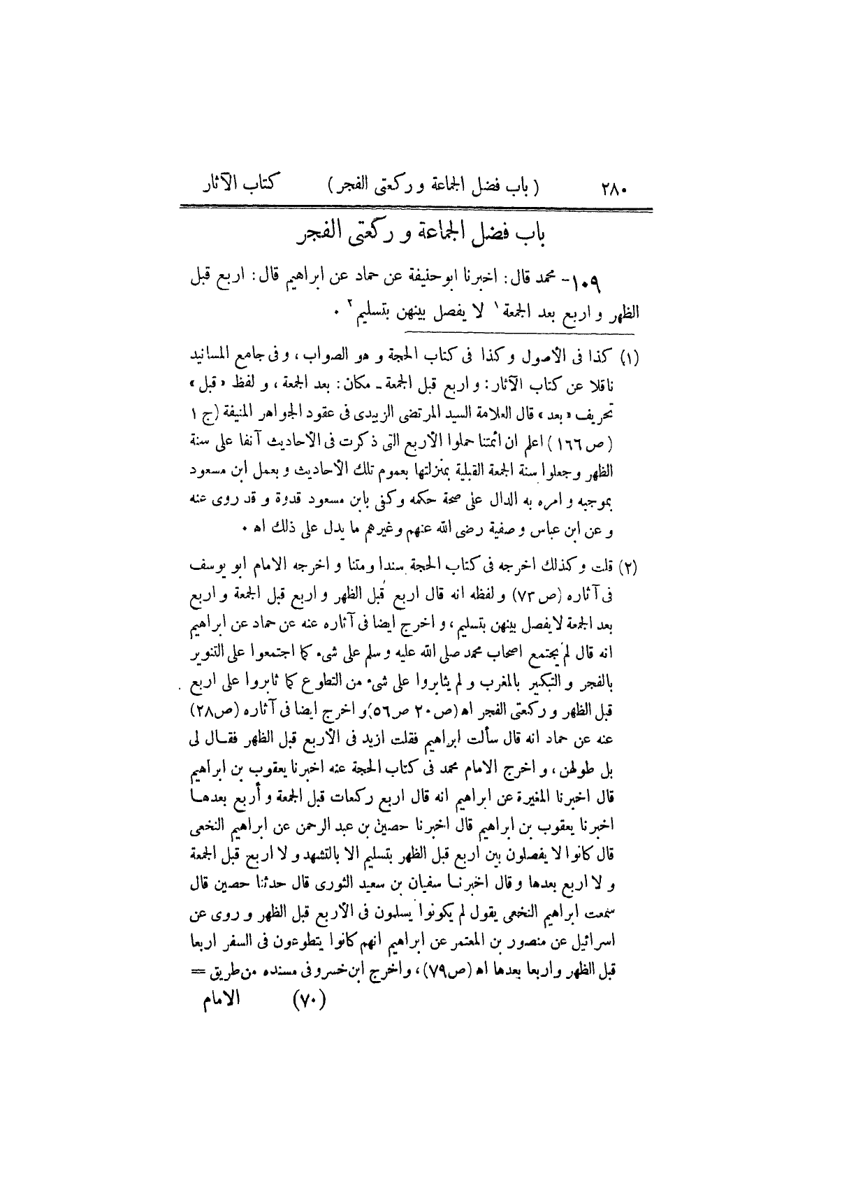 ١٠٩ - مُحَمَّدٌ، قَالَ: أَخْبَرَنَا أَبُو حَنِيفَةَ، عَنْ حَمَّادٍ، عَنْ إِبْرَاهِيمَ، قَالَ: «أَرْبَعٌ قَبْلَ الظُّهْرِ، وَأَرْبَعٌ بَعْدَ الْجُمُعَةِ، لَا يُفْصَلُ بَيْنَهُنَّ بِتَسْلِيمٍ» ⦗٢٨٧⦘ قَالَ مُحَمَّدٌ: وَبِهِ نَأْخُذُ، وَهُوَ قَوْلُ أَبِي حَنِيفَةَ رَضِيَ اللَّهُ عَنْهُ