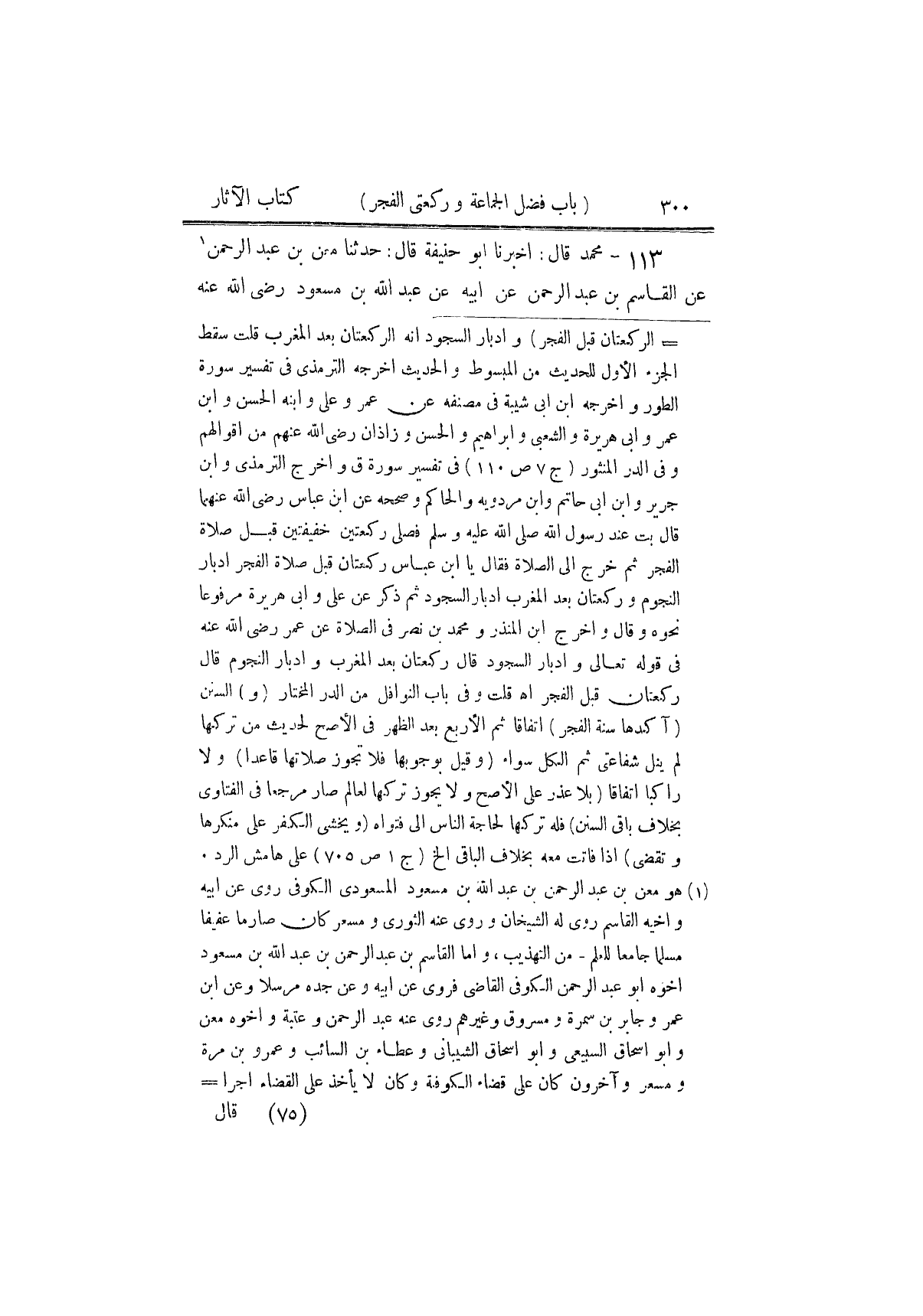 ١١٣ - مُحَمَّدٌ، قَالَ: أَخْبَرَنَا أَبُو حَنِيفَةَ، قَالَ حَدَّثَنَا مَعْنُ بْنُ عَبْدِ الرَّحْمَنِ، عَنِ الْقَاسِمِ بْنِ عَبْدِ الرَّحْمَنِ، عَنْ أَبِيهِ، عَنْ عَبْدِ اللَّهِ بْنِ مَسْعُودٍ رَضِيَ اللَّهُ عَنْهُ ⦗٣٠١⦘، قَالَ: «وَقِّرُوا الصَّلَاةَ» يَعْنِي السُّكُونَ فِيهَا قَالَ مُحَمَّدٌ: وَبِهِ نَأْخُذُ، وَهُوَ ⦗٣٠٢⦘ قَوْلُ أَبِي حَنِيفَةَ رَضِيَ اللَّهُ عَنْهُ