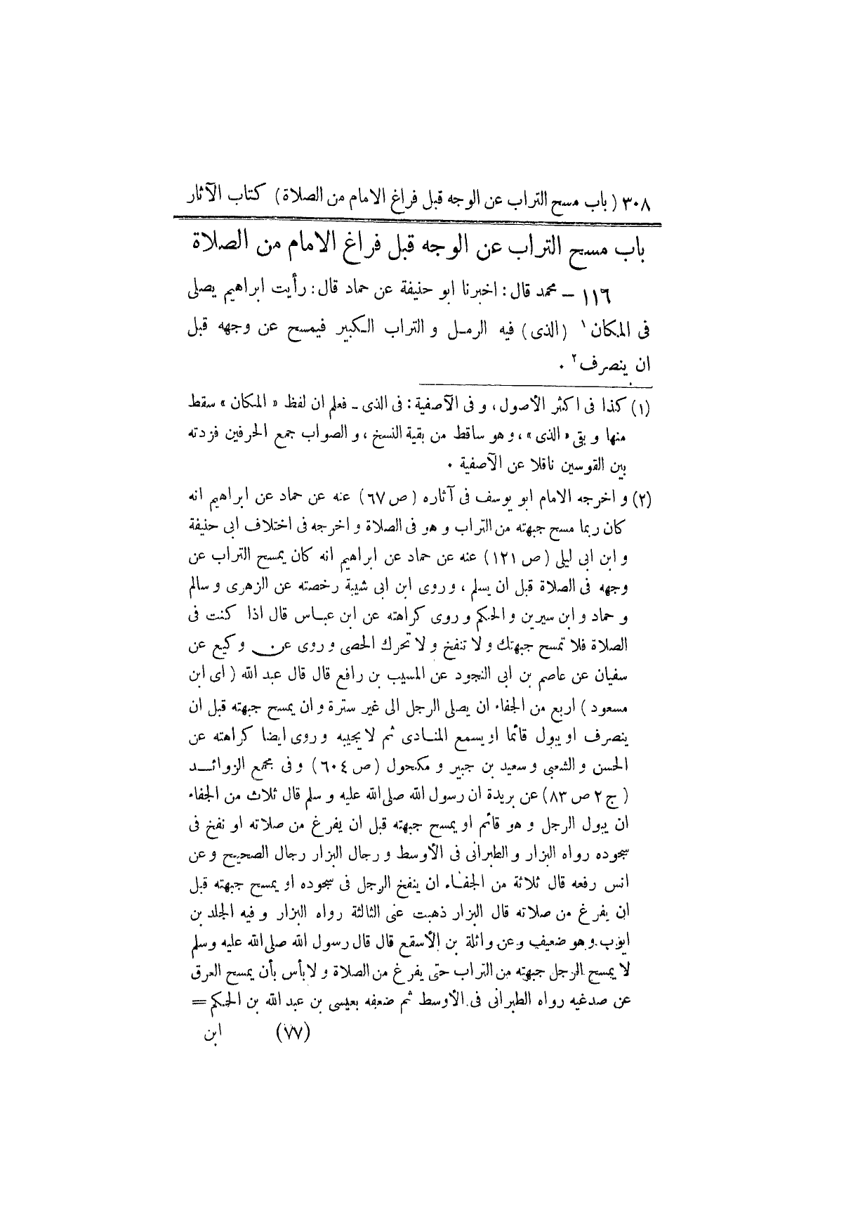 ١١٦ - مُحَمَّدٌ، قَالَ: أَخْبَرَنَا أَبُو حَنِيفَةَ، عَنْ حَمَّادٍ، قَالَ: رَأَيْتُ إِبْرَاهِيمَ يُصَلِّي فِي الْمَكَانِ الَّذِي فِيهِ الرَّمْلُ وَالتُّرَابُ الْكَبِيرُ فَيَمْسَحُ عَنْ وَجْهِهِ قَبْلَ أَنْ يَنْصَرِفَ " ⦗٣١١⦘ قَالَ مُحَمَّدٌ: لَا نَرَى بَأْسًا بِمَسْحِهِ ذَلِكَ قَبْلَ التَّشَهُّدِ وَالتَّسْلِيمِ؛ لِأَنَّ تَرْكَهُ يُؤْذِي الْمُصَلِّي، وَرُبَّمَا يَشْغَلُهُ عَنْ صَلَاتِهِ ⦗٣١٢⦘ وَهُوَ قَوْلُ أَبِي حَنِيفَةَ رَضِيَ اللَّهُ عَنْهُ