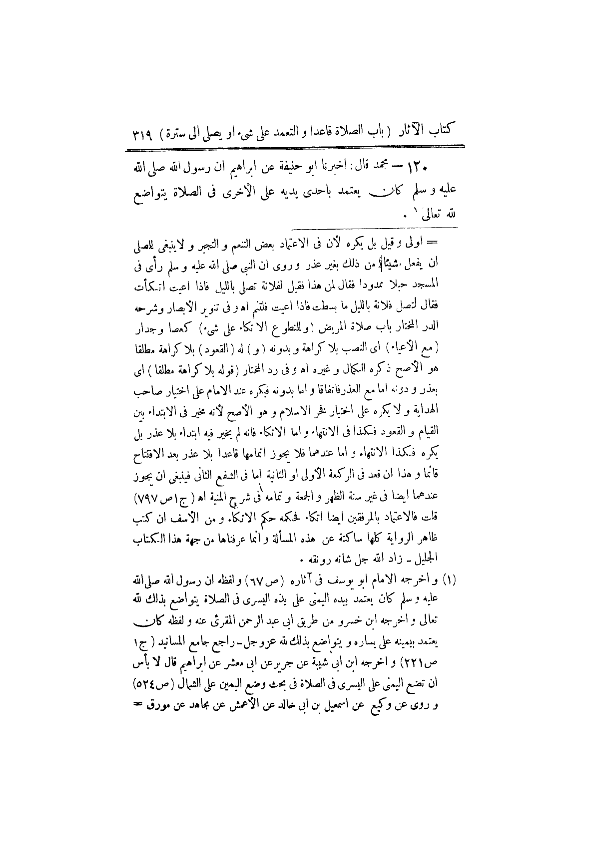 ١٢٠ - مُحَمَّدٌ، قَالَ: أَخْبَرَنَا أَبُو حَنِيفَةَ، عَنْ إِبْرَاهِيمَ، أَنَّ رَسُولَ اللَّهِ صَلَّى اللهُ عَلَيْهِ وَسَلَّمَ كَانَ يَعْتَمِدُ بِإِحْدَى يَدَيْهِ عَلَى الْأُخْرَى فِي الصَّلَاةِ، يَتَوَاضَعُ لِلَّهِ تَعَالَى " ⦗٣٢١⦘ قَالَ مُحَمَّدٌ: وَيَضَعُ بَطْنَ كَفِّهِ الْأَيْمَنِ عَلَى رُسْغِهِ الْأَيْسَرِ تَحْتَ السُّرَّةِ فَيَكُونُ الرُّسْغُ فِي وَسَطِ الْكَفِّ