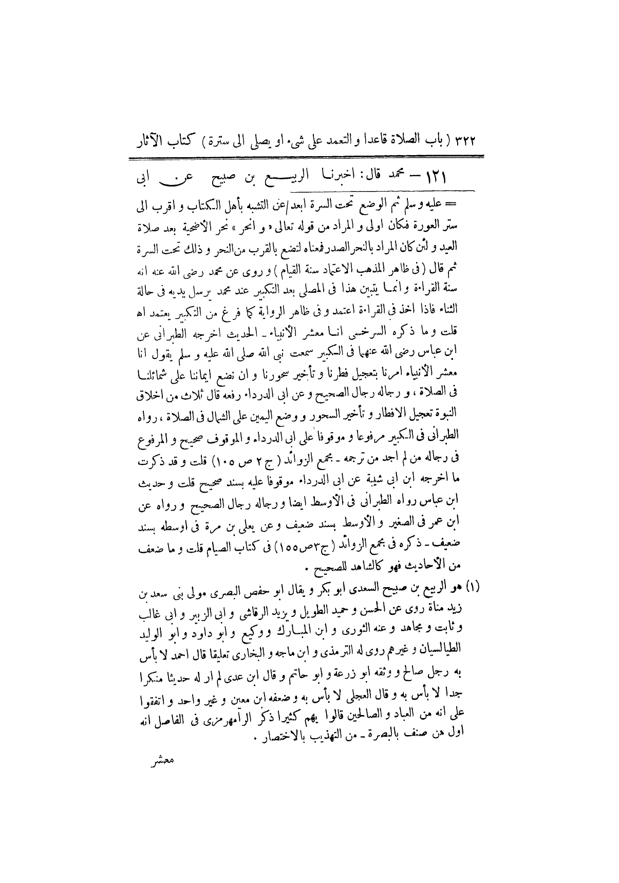 ١٢١ - مُحَمَّدٌ، قَالَ: أَخْبَرَنَا الرَّبِيعُ بْنُ صُبَيْحٍ، عَنْ أَبِي ⦗٣٢٣⦘ مَعْشَرَ، عَنْ إِبْرَاهِيمَ النَّخَعِيِّ أَنَّهُ كَانَ يَضَعُ يَدَهُ الْيُمْنَى عَلَى يَدِهِ الْيُسْرَى تَحْتَ السُّرَّةِ ⦗٣٢٥⦘ قَالَ مُحَمَّدٌ: وَبِهِ نَأْخُذُ، وَهُوَ قَوْلُ أَبِي حَنِيفَةَ رَضِيَ اللَّهُ عَنْهُ