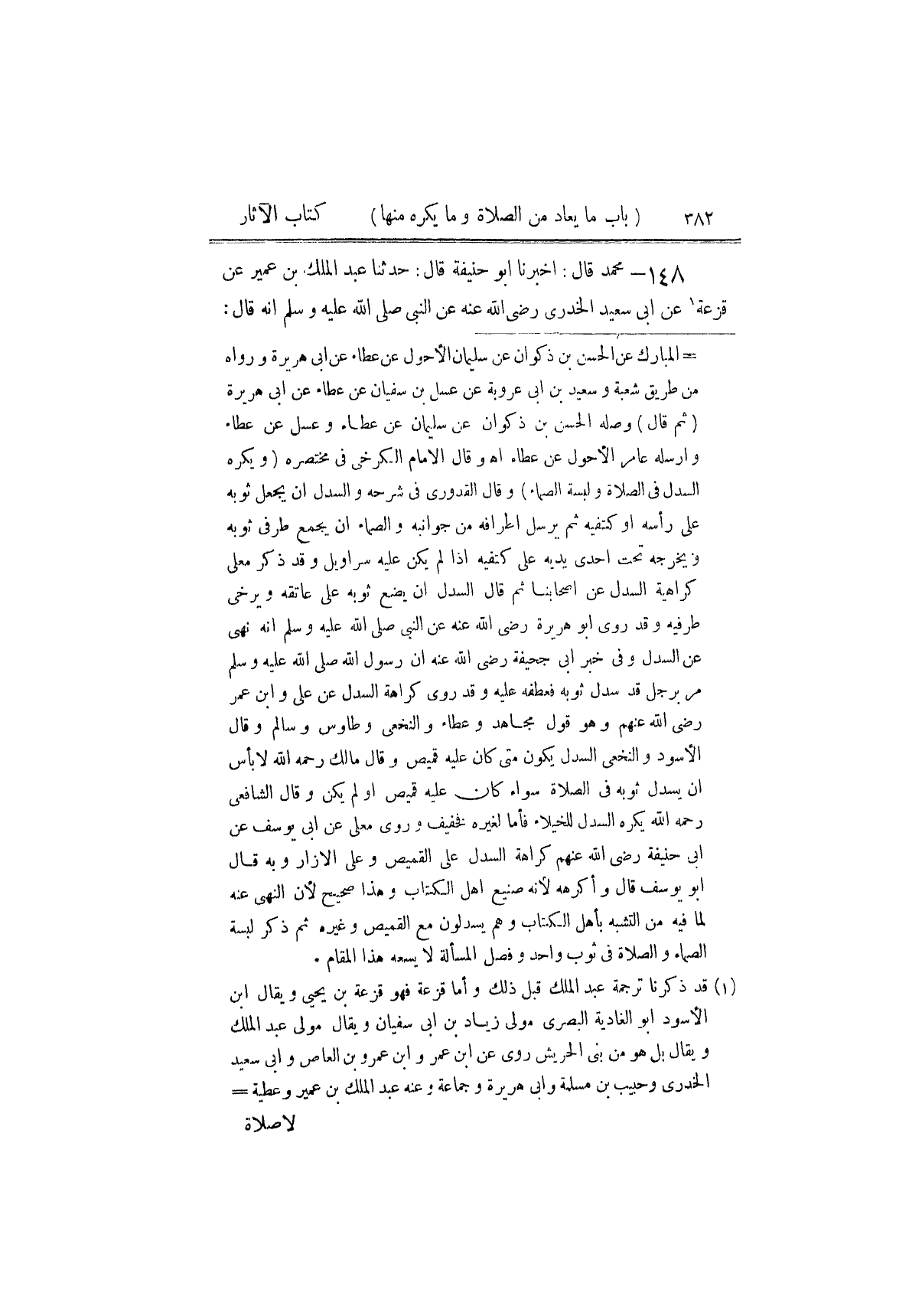 ١٤٨ - مُحَمَّدٌ، قَالَ: أَخْبَرَنَا أَبُو حَنِيفَةَ، قَالَ حَدَّثَنَا عَبْدُ الْمَلِكِ بْنُ عُمَيْرٍ، عَنْ قَزَعَةَ، عَنْ أَبِي سَعِيدٍ الْخُدْرِيِّ رَضِيَ اللَّهُ عَنْهُ عَنِ النَّبِيِّ صَلَّى اللهُ عَلَيْهِ وَسَلَّمَ، أَنَّهُ قَالَ ⦗٣٨٣⦘: " لَا صَلَاةَ بَعْدَ الْغَدَاةِ حَتَّى تَطْلُعَ الشَّمْسُ، وَلَا صَلَاةَ بَعْدَ الْعَصْرِ حَتَّى تَغْرُبَ ⦗٣٨٦⦘، وَلَا يُصَامُ هَذَانِ الْيَوْمَانِ: الْفِطْرُ وَالْأَضْحَى، وَلَا تُشَدُّ الرِّحَالُ إِلَّا إِلَى ثَلَاثَةِ ⦗٣٨٨⦘ مَسَاجِدَ: الْمَسْجِدِ الْحَرَامِ، وَمَسْجِدِي وَالْمَسْجِدِ الْأَقْصَى، وَلَا تُسَافِرُ الْمَرْأَةُ ⦗٣٩٢⦘ إِلَّا مَعَ ذِي مَحْرَمٍ مِنْهَا " ⦗٣٩٤⦘ قَالَ مُحَمَّدٌ: وَبِهَذَا كُلِّهِ نَأْخُذُ، وَلَا يَنْبَغِي لِلْمَرْأَةِ أَنْ تُسَافِرَ إِلَّا مَعَ زَوْجِهَا أَوْ مَعَ ذِي مَحْرَمٍ مِنْهَا. وَهُوَ قَوْلُ أَبِي حَنِيفَةَ رَضِيَ اللَّهُ عَنْهُ