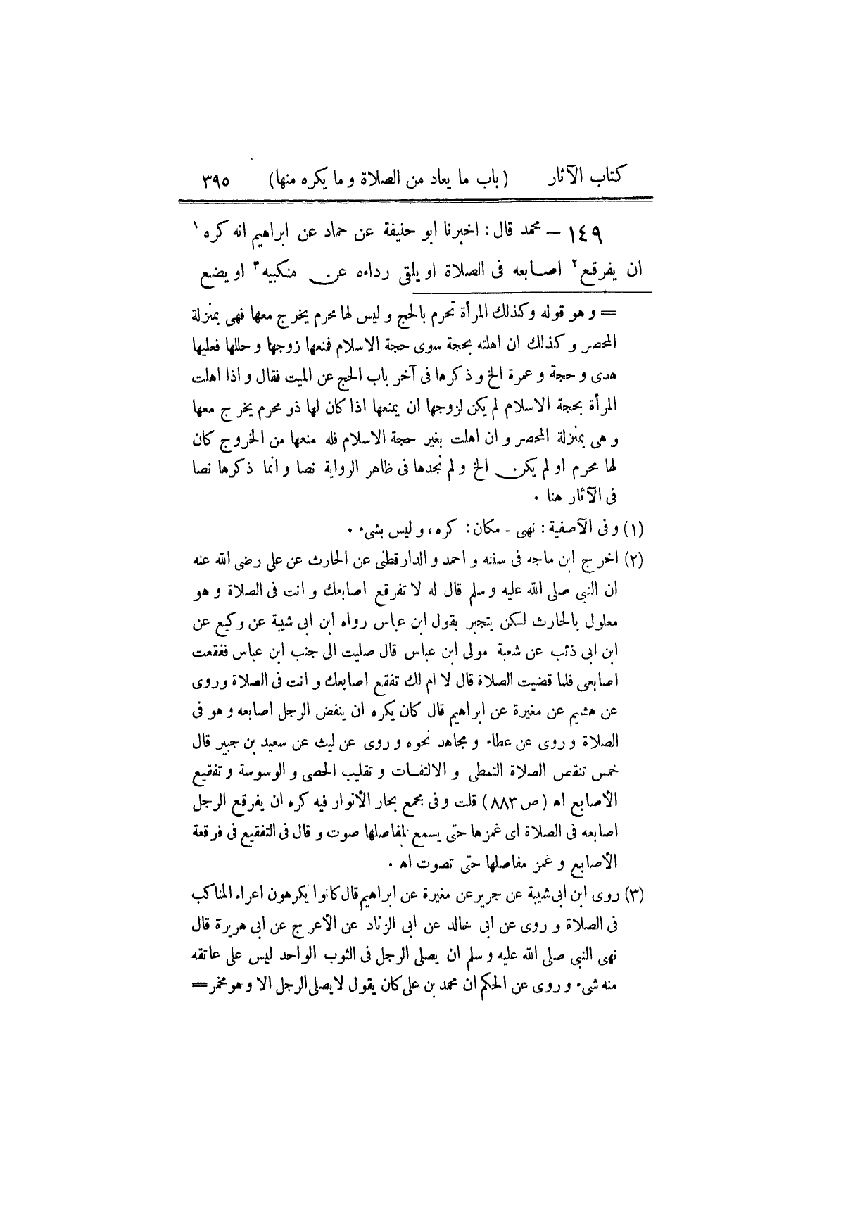 ١٤٩ - مُحَمَّدٌ، قَالَ: أَخْبَرَنَا أَبُو حَنِيفَةَ، عَنْ حَمَّادٍ، عَنْ إِبْرَاهِيمَ أَنَّهُ «كَرِهَ أَنْ يُفَرْقِعَ أَصَابِعَهُ فِي الصَّلَاةِ أَوْ يُلْقِيَ رِدَاءَهُ عَنْ مَنْكِبَيْهِ، أَوْ يَضَعَ ⦗٣٩٦⦘ يَدَهُ عَلَى خَاصِرَتِهِ، أَوْ يَدْفِنَ كِبَارَ الْحَصَى أَوْ يُقْعِيَ عَلَى ⦗٣٩٧⦘ عَقِبَيْهِ أَوْ يَعْبَثَ بِلِحْيَتِهِ» ⦗٣٩٩⦘ قَالَ مُحَمَّدٌ: وَبِهِ نَأْخُذُ، لِأَنَّهُ عَبَثٌ فِي الصَّلَاةِ يُشْغِلُ عَنْهَا. وَهُوَ قَوْلُ أَبِي حَنِيفَةَ رَضِيَ اللَّهُ عَنْهُ