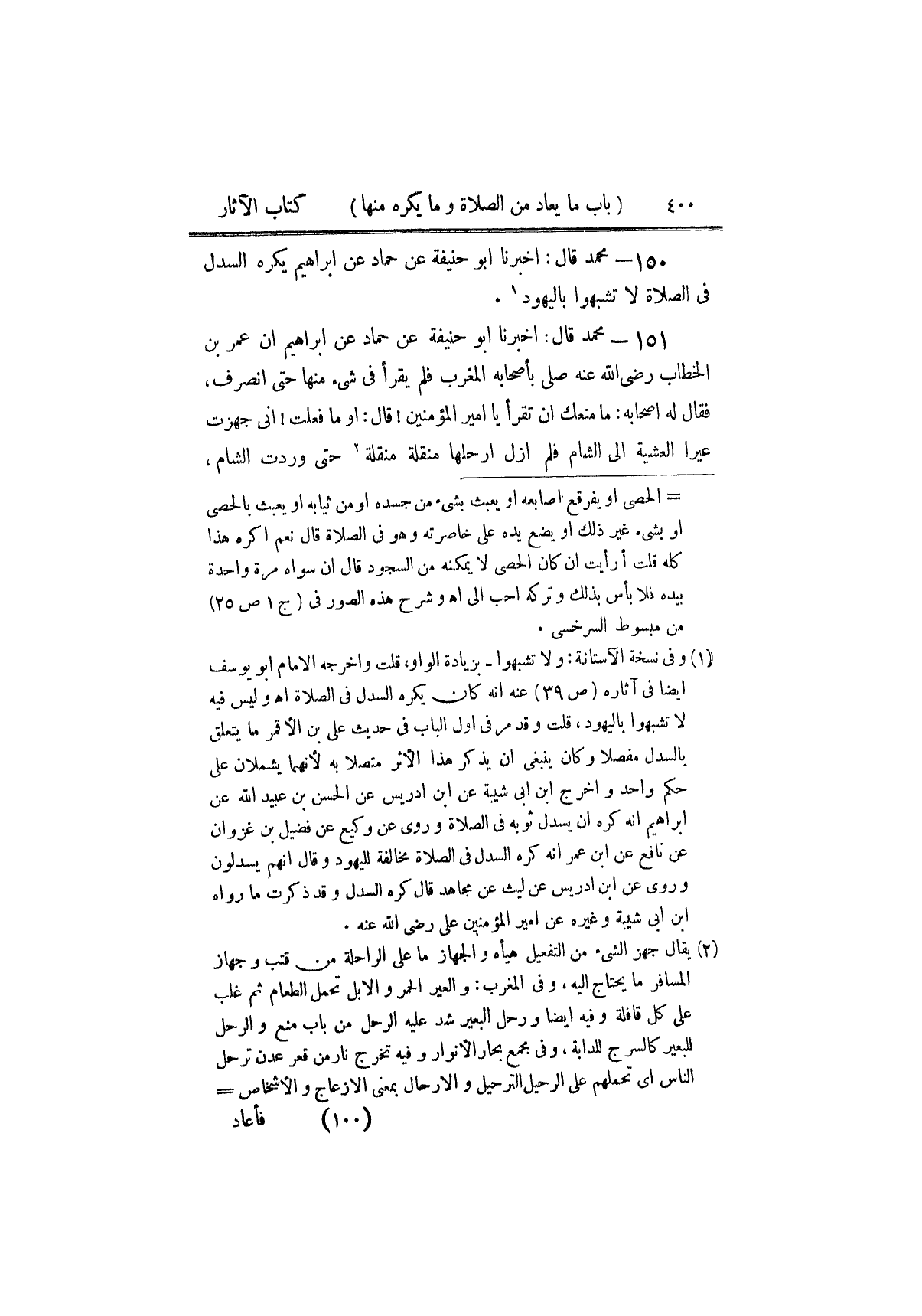 ١٥٠ - مُحَمَّدٌ، قَالَ: أَخْبَرَنَا أَبُو حَنِيفَةَ، عَنْ حَمَّادٍ، عَنْ إِبْرَاهِيمَ «يُكْرَهُ السَّدْلُ فِي الصَّلَاةِ لَا تَشَبَّهُوا بِالْيَهُودِ»