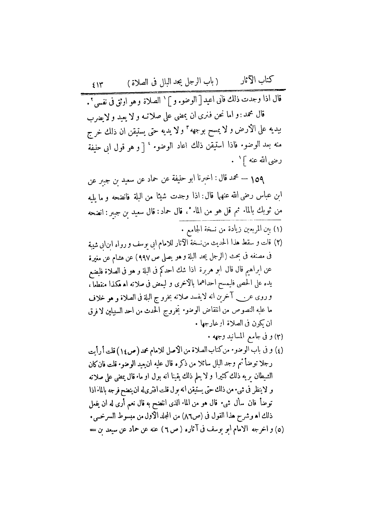 ١٥٩ - مُحَمَّدٌ، قَالَ: أَخْبَرَنَا أَبُو حَنِيفَةَ، عَنْ حَمَّادٍ، عَنْ سَعِيدِ بْنِ جُبَيْرٍ، عَنِ ابْنِ عَبَّاسٍ رَضِيَ اللَّهُ عَنْهُمَا قَالَ: «إِذَا وَجَدْتَ شَيْئًا مِنَ الْبِلَّةِ، فَانْضَحْهُ، وَمَا يَلِيهِ مِنْ ثَوْبِكَ بِالْمَاءِ، ثُمَّ قُلْ هُوَ مِنَ الْمَاءِ» قَالَ حَمَّادٌ: قَالَ سَعِيدُ بْنُ جُبَيْرٍ: «انْضَحْهُ ⦗٤١٤⦘ بِالْمَاءِ ثُمَّ إِذَا وَجَدْتَهُ، فَقُلْ هُوَ مِنَ الْمَاءِ» ⦗٤١٥⦘ قَالَ مُحَمَّدٌ: وَبِهَذَا نَأْخُذُ، إِذَا كَانَ كَثُرَ ذَلِكَ مِنَ الْإِنْسَانِ. وَهُوَ قَوْلُ أَبِي حَنِيفَةَ رَضِيَ اللَّهُ عَنْهُ