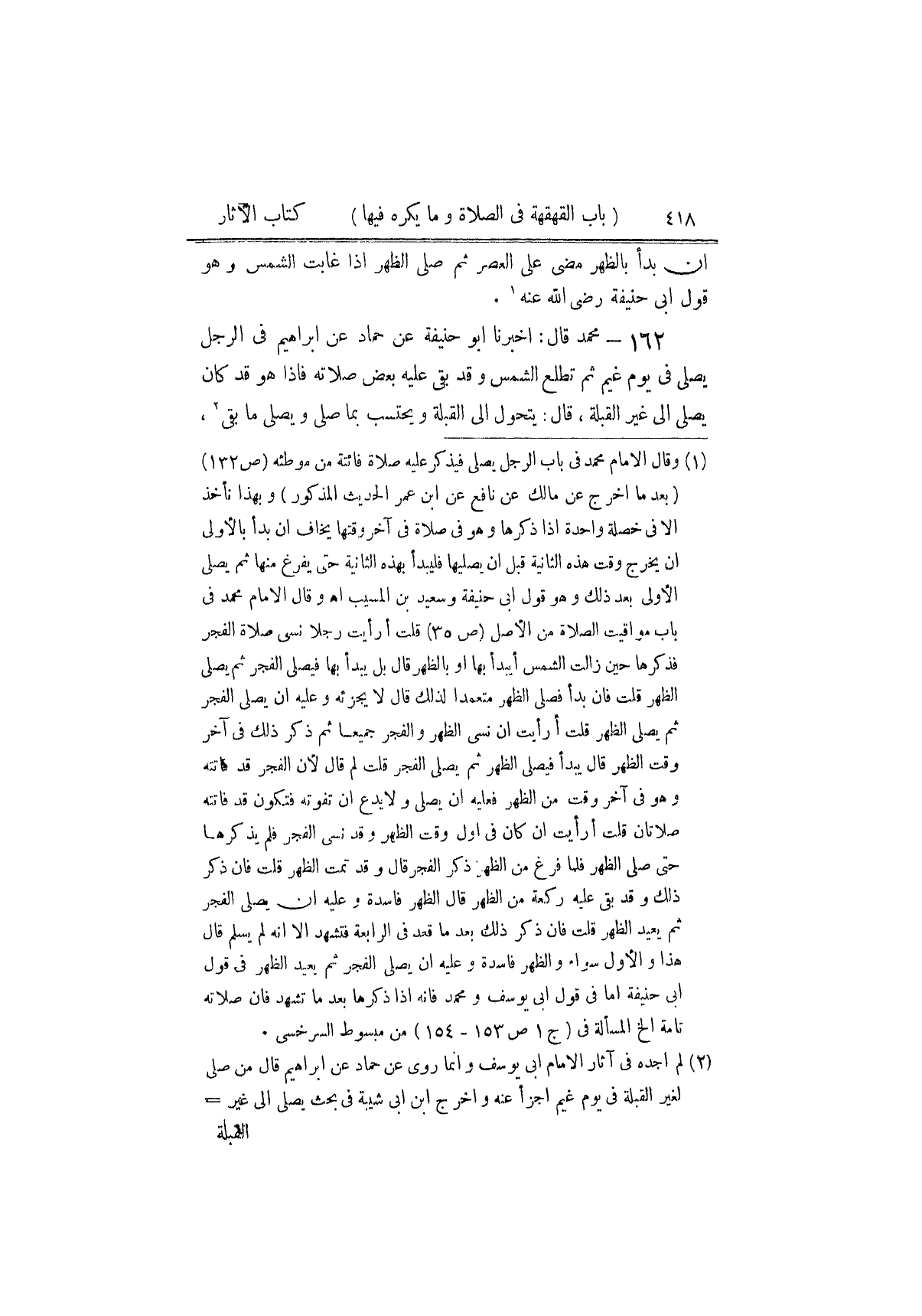 ١٦٢ - مُحَمَّدٌ، قَالَ: أَخْبَرَنَا أَبُو حَنِيفَةَ، عَنْ حَمَّادٍ، عَنْ إِبْرَاهِيمَ فِي " الرَّجُلِ يُصَلِّي فِي يَوْمِ غَيْمٍ ثُمَّ تَطْلُعُ الشَّمْسُ وَقَدْ بَقِيَ عَلَيْهِ بَعْضُ صَلَاتِهِ، فَإِذَا هُوَ قَدْ كَانَ يُصَلِّي إِلَى غَيْرِ الْقِبْلَةِ، قَالَ: يَتَحَوَّلُ إِلَى الْقِبْلَةِ، وَيَحْتَسِبُ بِمَا صَلَّى وَيُصَلِّي مَا بَقِيَ " ⦗٤٢٠⦘ قَالَ مُحَمَّدٌ: وَبِهِ نَأْخُذُ، وَهُوَ قَوْلُ أَبِي حَنِيفَةَ رَضِيَ اللَّهُ عَنْهُ