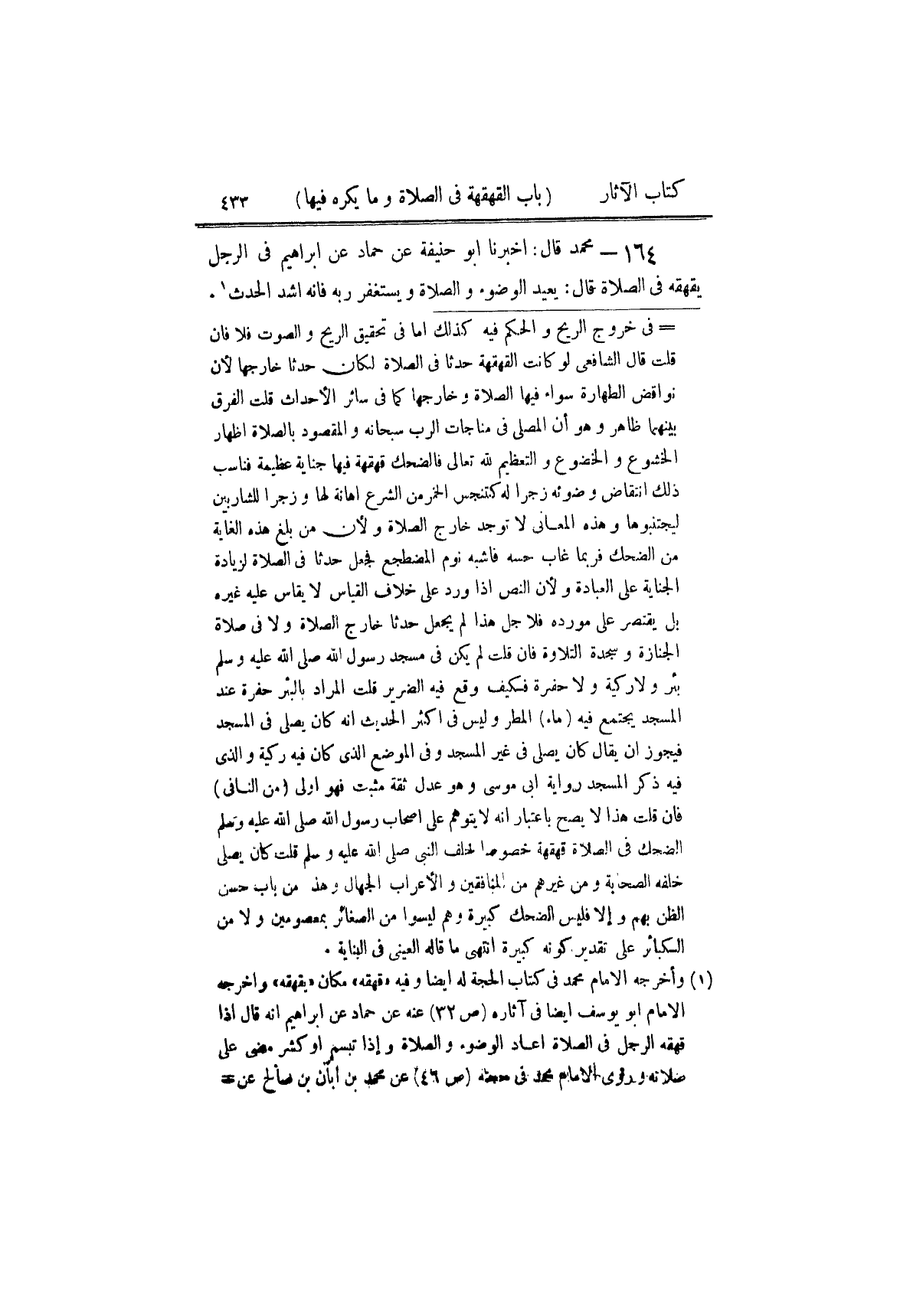 ١٦٤ - مُحَمَّدٌ، قَالَ: أَخْبَرَنَا أَبُو حَنِيفَةَ، عَنْ حَمَّادٍ، عَنْ إِبْرَاهِيمَ فِي الرَّجُلِ يُقَهْقِهُ فِي الصَّلَاةِ، قَالَ: «يُعِيدُ الْوُضُوءَ وَالصَّلَاةَ، وَيَسْتَغْفِرُ رَبَّهُ؛ فَإِنَّهُ أَشَدُّ الْحَدَثِ» ⦗٤٣٤⦘ قَالَ مُحَمَّدٌ: وَبِهِ نَأْخُذُ، وَهُوَ قَوْلُ أَبِي حَنِيفَةَ رَضِيَ اللَّهُ عَنْهُ