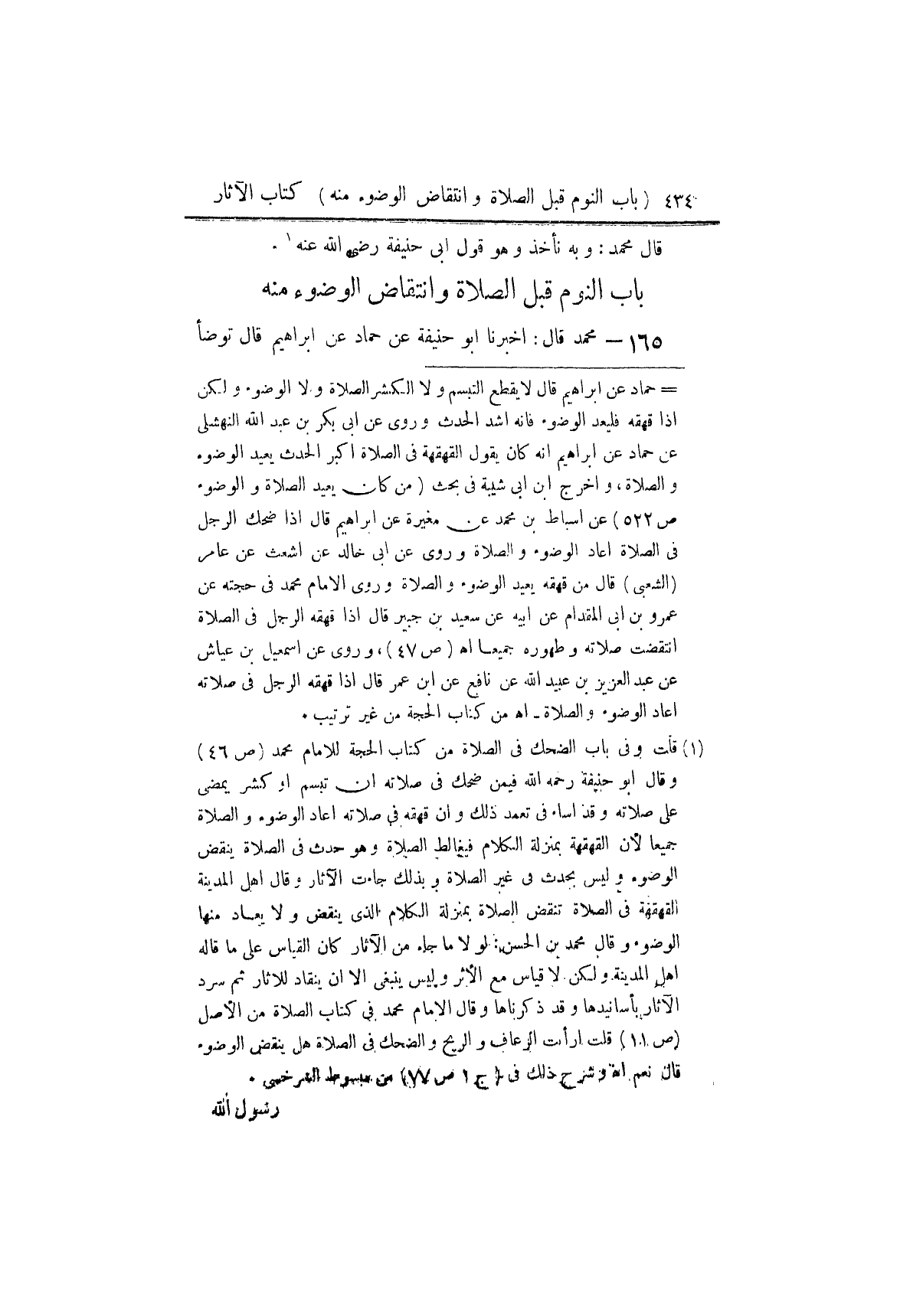 ١٦٥ - مُحَمَّدٌ، قَالَ: أَخْبَرَنَا أَبُو حَنِيفَةَ، عَنْ حَمَّادٍ، عَنْ إِبْرَاهِيمَ، قَالَ: «تَوَضَّأَ ⦗٤٣٥⦘ رَسُولُ اللَّهِ صَلَّى اللهُ عَلَيْهِ وَسَلَّمَ فَخَرَجَ إِلَى الْمَسْجِدِ، فَوَجَدَ الْمُؤَذِّنَ قَدْ أَذَّنَ، فَوَضَعَ جَنْبَهُ فَنَامَ حَتَّى عُرِفَ مِنْهُ النَّوْمُ، وَكَانَتْ لَهُ نَوْمَةٌ تُعْرَفُ، كَانَ يَنْفُخُ إِذَا نَامَ ثُمَّ قَامَ فَصَلَّى بِغَيْرِ وُضُوءٍ» قَالَ إِبْرَاهِيمُ: «إِنَّ النَّبِيَّ صَلَّى اللهُ عَلَيْهِ وَسَلَّمَ، لَيْسَ كَغَيْرِهِ» قَالَ مُحَمَّدٌ: وَبِقَوْلِ إِبْرَاهِيمَ نَأْخُذُ بَلَغَنَا أَنَّ النَّبِيَّ صَلَّى اللهُ عَلَيْهِ وَسَلَّمَ قَالَ: «إِنَّ عَيْنَيَّ تَنَامَانِ وَلَا يَنَامُ قَلْبِي» فَالنَّبِيُّ صَلَّى اللهُ عَلَيْهِ وَسَلَّمَ فِي هَذَا لَيْسَ كَغَيْرِهِ ⦗٤٣٦⦘، فَأَمَّا مَنْ سِوَاهُ، فَمَنْ وَضَعَ جَنْبَهُ فَنَامَ، فَقَدْ وَجَبَ عَلَيْهِ الْوُضُوءُ، وَهُوَ قَوْلُ أَبِي حَنِيفَةَ رَضِيَ اللَّهُ عَنْهُ