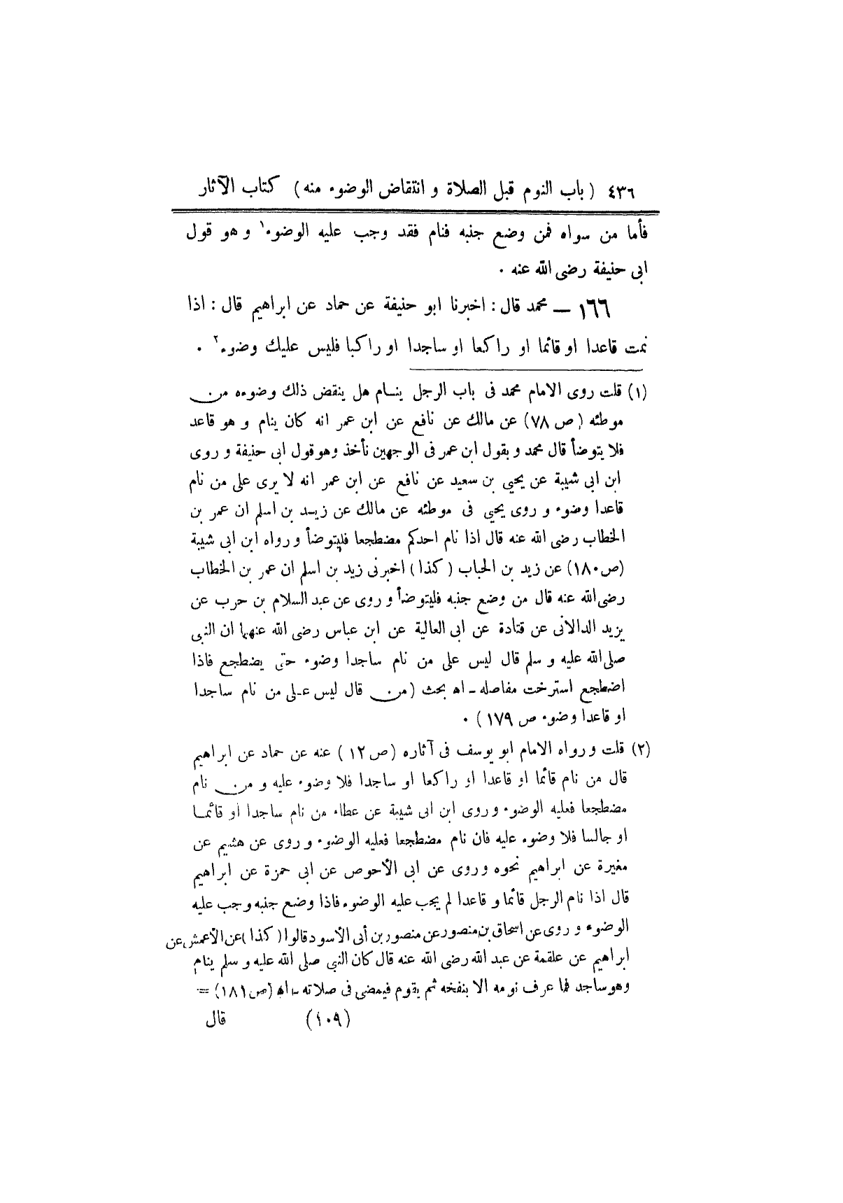 ١٦٦ - مُحَمَّدٌ، قَالَ: أَخْبَرَنَا أَبُو حَنِيفَةَ، عَنْ حَمَّادٍ، عَنْ إِبْرَاهِيمَ، قَالَ: «إِذَا نِمْتَ قَاعِدًا أَوْ قَائِمًا أَوْ رَاكِعًا أَوْ سَاجِدًا أَوْ رَاكِبًا فَلَيْسَ عَلَيْكَ وُضُوءٌ» ⦗٤٣٧⦘ قَالَ مُحَمَّدٌ: وَبِهِ نَأْخُذُ، فَإِذَا وَضَعَ جَنْبَهُ فَنَامَ وَجَبَ عَلَيْهِ الْوُضُوءُ. وَهُوَ قَوْلُ أَبِي حَنِيفَةَ رَضِيَ اللَّهُ عَنْهُ