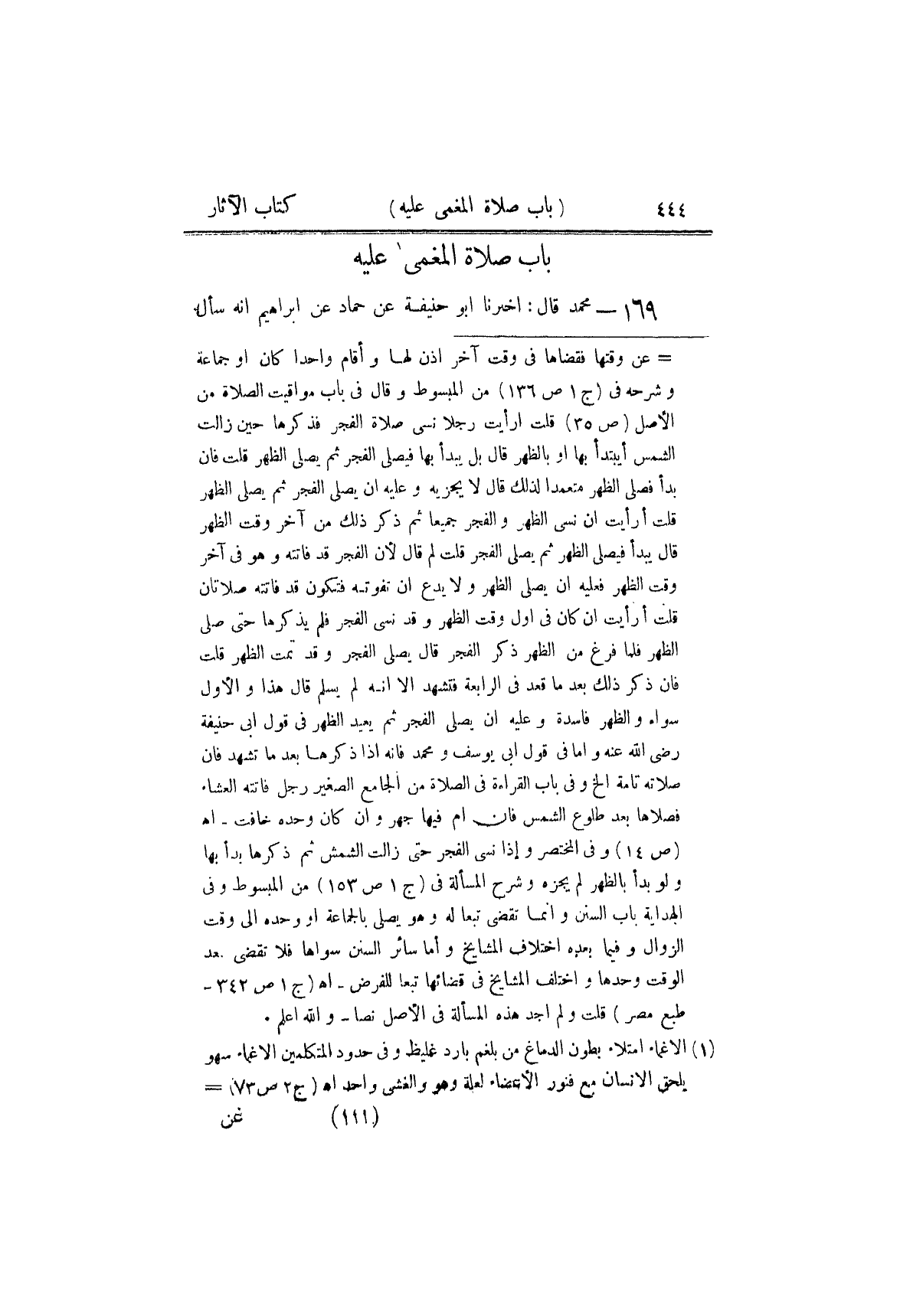 ١٦٩ - مُحَمَّدٌ، قَالَ: أَخْبَرَنَا أَبُو حَنِيفَةَ، عَنْ حَمَّادٍ، عَنْ إِبْرَاهِيمَ أَنَّهُ سَأَلَهُ ⦗٤٤٥⦘ عَنِ الرَّجُلِ الْمَرِيضِ يُغْمَى عَلَيْهِ فَيَدَعُ الصَّلَاةَ، قَالَ: «إِذَا كَانَ الْيَوْمُ الْوَاحِدُ، فَإِنِّي أُحِبُّ أَنْ يَقْضِيَهُ، وَإِنْ كَانَ أَكْثَرَ مِنْ ذَلِكَ، فَإِنَّهُ فِي عُذْرٍ إِنْ شَاءَ اللَّهُ» قَالَ مُحَمَّدٌ: إِذَا أُغْمِيَ عَلَيْهِ يَوْمًا وَلَيْلَةً قَضَى، وَإِنْ كَانَ أَكْثَرَ مِنْ ذَلِكَ فَلَا قَضَاءَ عَلَيْهِ، وَهُوَ قَوْلُ أَبِي حَنِيفَةَ رَضِيَ اللَّهُ عَنْهُ