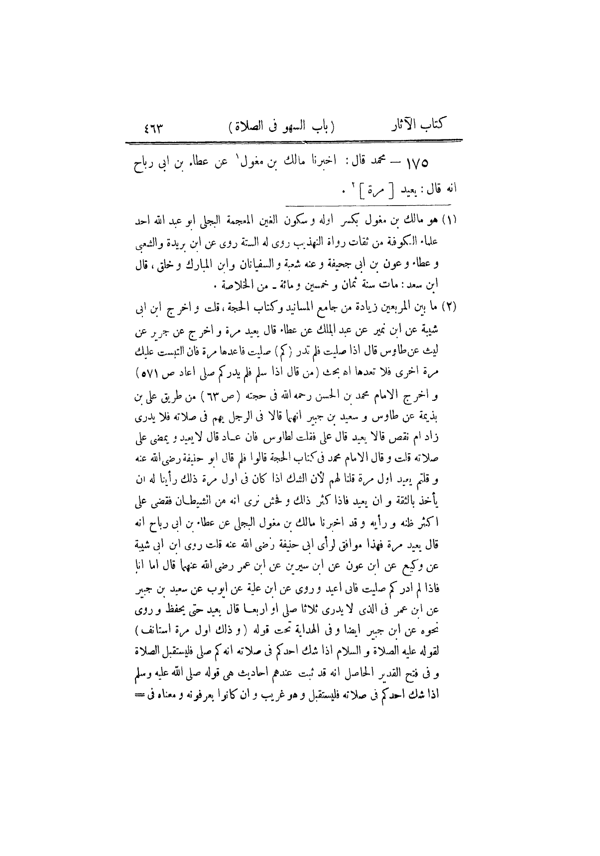١٧٥ - مُحَمَّدٌ، قَالَ: أَخْبَرَنَا مَالِكُ بْنُ مِغْوَلٍ، عَنْ عَطَاءِ بْنِ أَبِي رَبَاحٍ، أَنَّهُ قَالَ: «يُعِيدُ مَرَّةً» ⦗٤٦٥⦘ قَالَ مُحَمَّدٌ: وَبِهِ نَأْخُذُ، وَهُوَ قَوْلُ أَبِي حَنِيفَةَ رَضِيَ اللَّهُ عَنْهُ